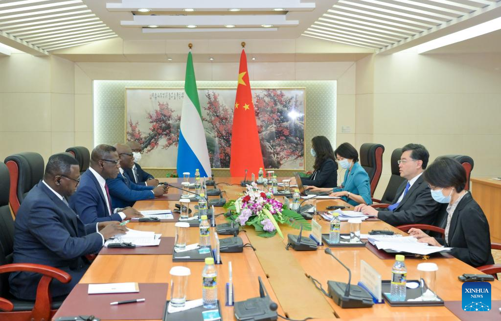 BEIJING, May 16 (Xinhua) -- Chinese State Councilor and Foreign Minister Qin Gang held talks with Sierra Leonean Minister of Foreign Affairs and International Cooperation David Francis in Beijing on Tuesday.