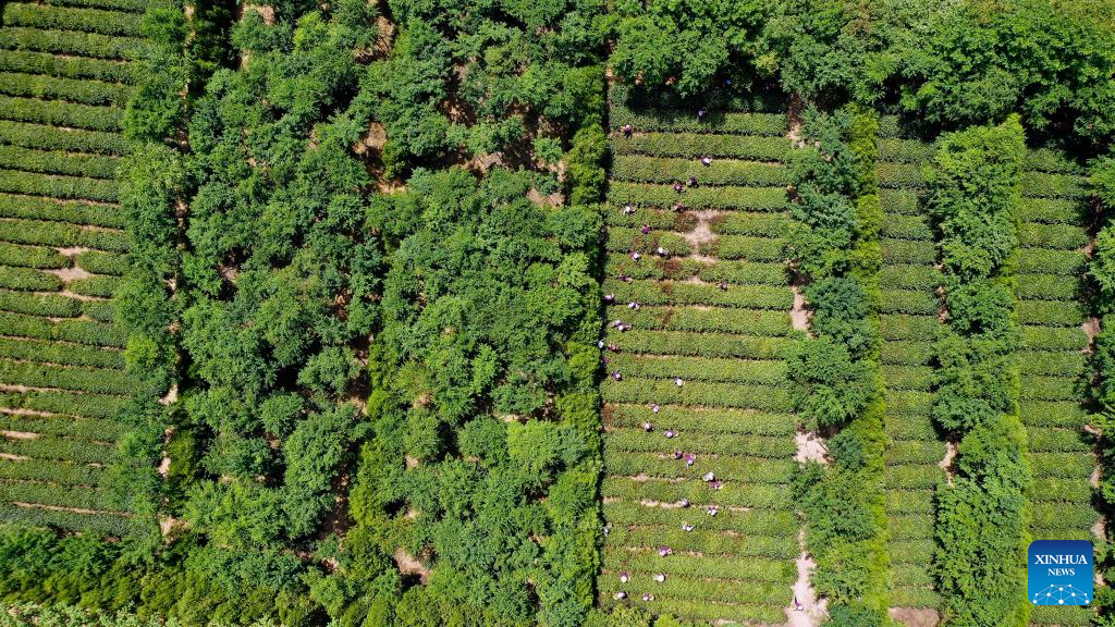 This aerial photo taken on May 16, 2023 shows farmers picking tea leaves at a tea garden in Wulian County of Rizhao City, east China's Shandong Province. In recent years, Wulian County has promoted the development of the tea industry, which has helped increase villagers' income and boost rural revitalization. Wulian County now has tea gardens covering a total area of 37,000 mu (about 2,466.7 hectares), with an annual output value of about 260 million yuan (about 37.3 million U.S. dollars). (Xinhua/Guo Xulei)