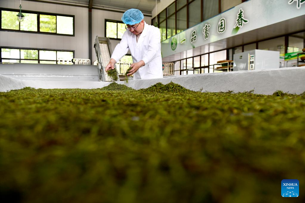 A worker processes tea leaves at a factory in Wulian County of Rizhao City, east China's Shandong Province, May 16, 2023. In recent years, Wulian County has promoted the development of the tea industry, which has helped increase villagers' income and boost rural revitalization. Wulian County now has tea gardens covering a total area of 37,000 mu (about 2,466.7 hectares), with an annual output value of about 260 million yuan (about 37.3 million U.S. dollars). (Xinhua/Wang Nian)