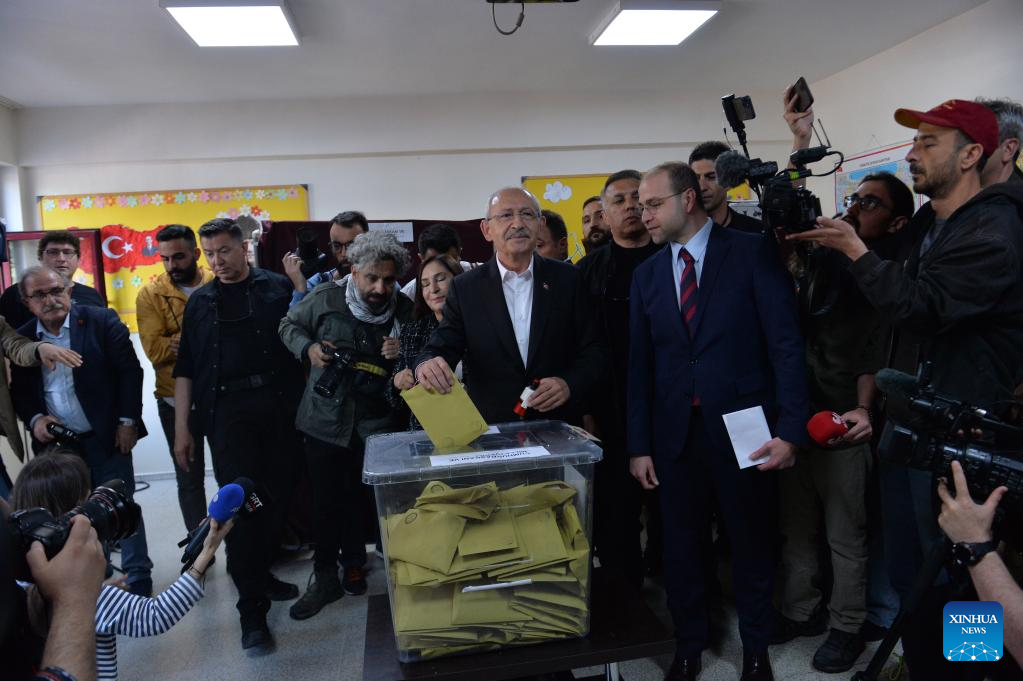 Kemal Kilicdaroglu (C), the leader of the six-party opposition bloc, casts his vote at a polling station in Ankara, Türkiye, on May 14, 2023. As Türkiye's presidential elections are heading to a first-ever run-off, key economic challenges lie ahead. Taming inflation while maintaining monetary stability is vital for the country's economy, experts said. (Photo by Mustafa Kaya/Xinhua)