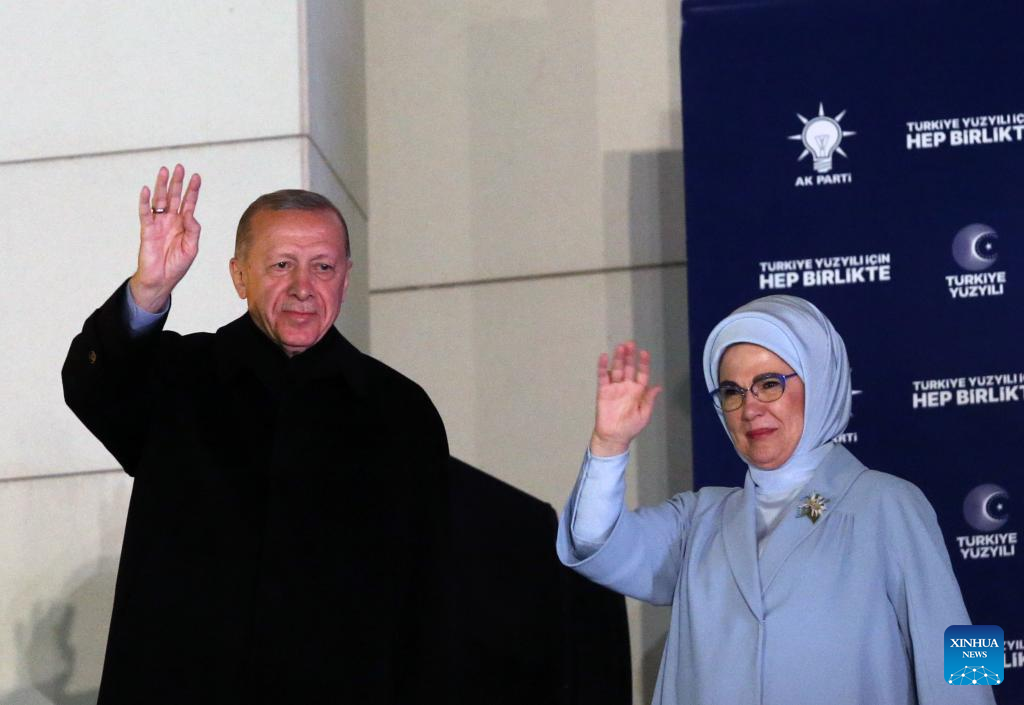 Turkish President Recep Tayyip Erdogan and his wife Emine Erdogan wave to supporters at the headquarters of Justice and Development Party (AKP) in Ankara, Türkiye, on May 15, 2023. As Türkiye's presidential elections are heading to a first-ever run-off, key economic challenges lie ahead. Taming inflation while maintaining monetary stability is vital for the country's economy, experts said. (Photo by Mustafa Kaya/Xinhua)