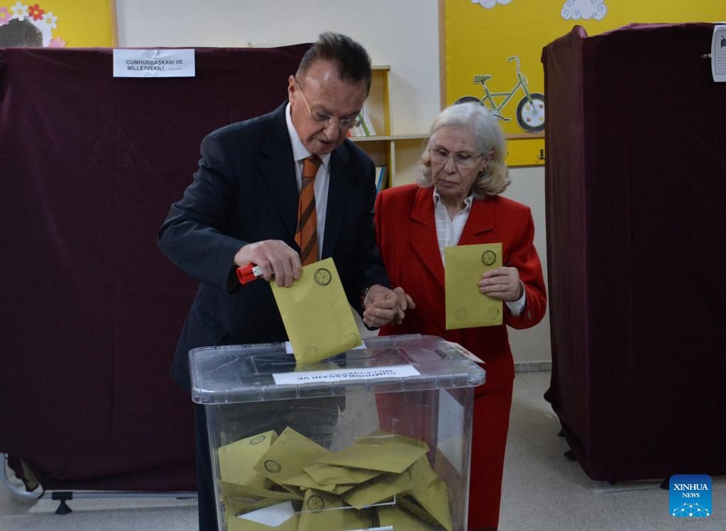 A couple cast their ballots at a polling station in Ankara, Türkiye, on May 14, 2023. As Türkiye's presidential elections are heading to a first-ever run-off, key economic challenges lie ahead. Taming inflation while maintaining monetary stability is vital for the country's economy, experts said. (Photo by Mustafa Kaya/Xinhua)