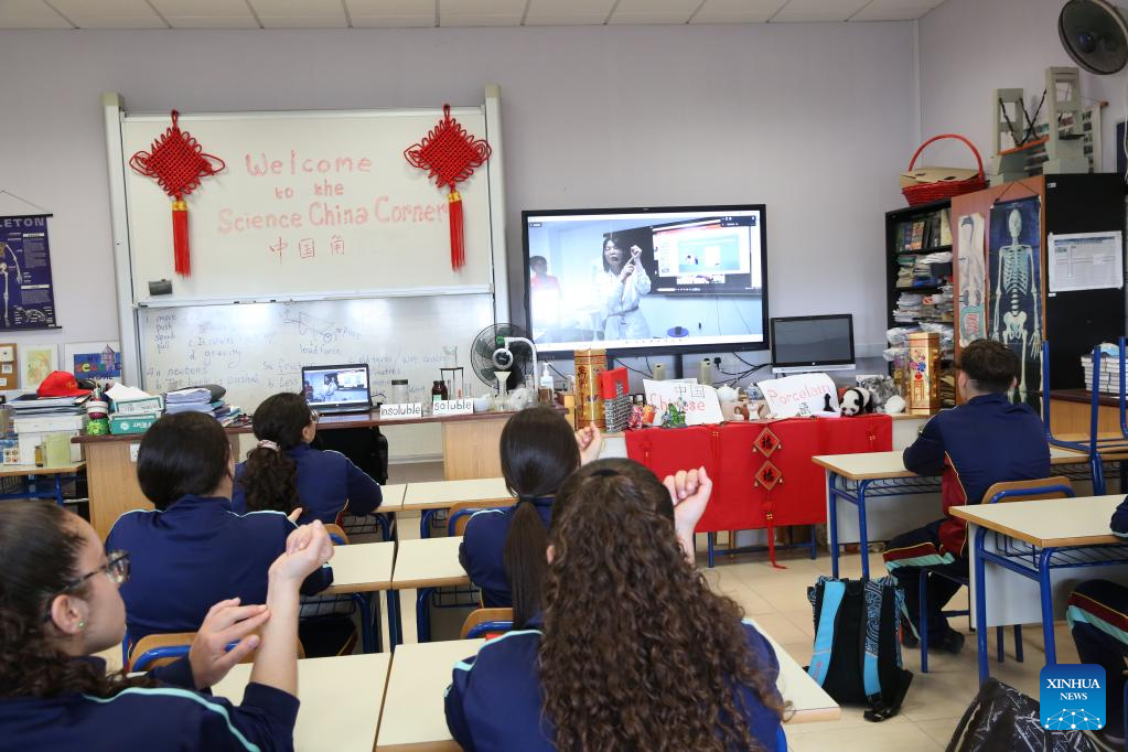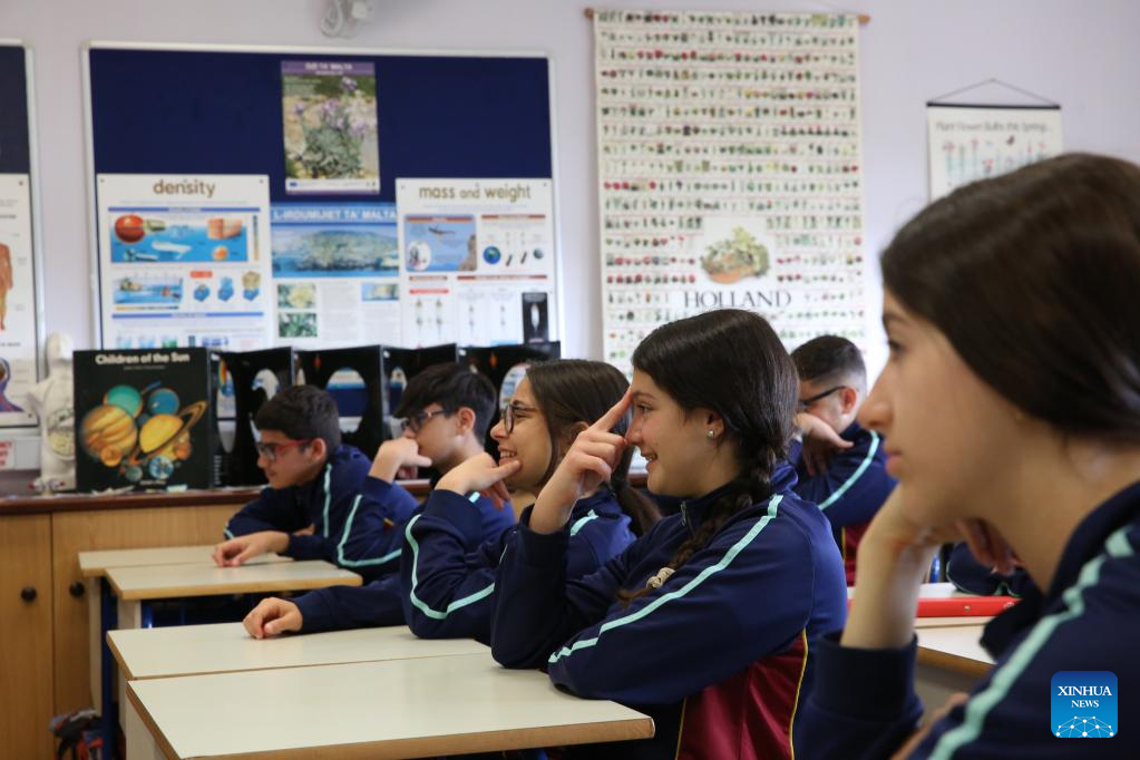 Students attend an online class on the benefits of Chinese acupressure techniques at St. Margaret College Secondary School in Cospiqua, Malta, on May 16, 2023. The online class on traditional Chinese medicine (TCM) was held with students at the "China Corner" at St. Margaret College Secondary School on Tuesday. (Xinhua/Chen Wenxian)