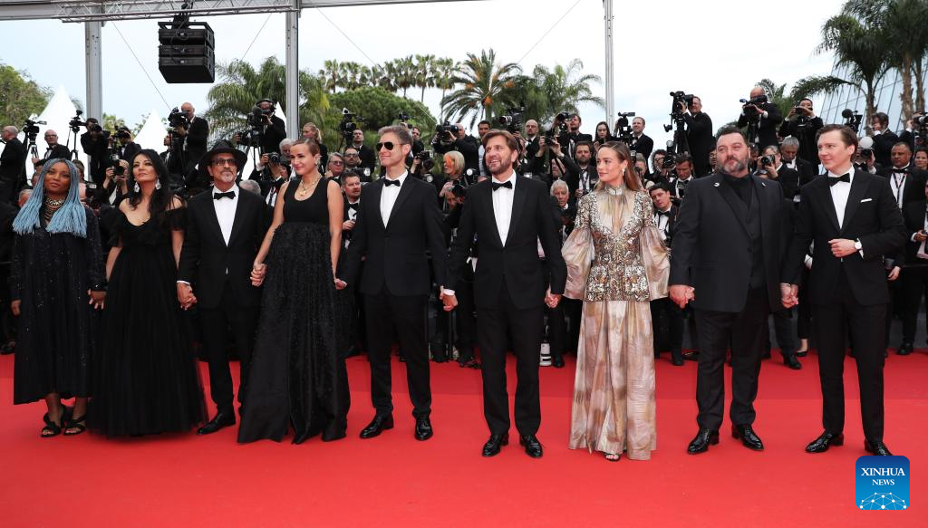 Swedish director and President of the Jury of the 76th Cannes Film Festival Ruben Ostlund (C) poses with members of the main competition jury for the opening ceremony of the 76th edition of the Cannes Film Festival in Cannes, southern France, on May 16, 2023. The 76th edition of the Cannes Film Festival kicked off on Tuesday evening, with 21 films selected to compete for the Palme d'Or top prize. (Xinhua/Gao Jing)