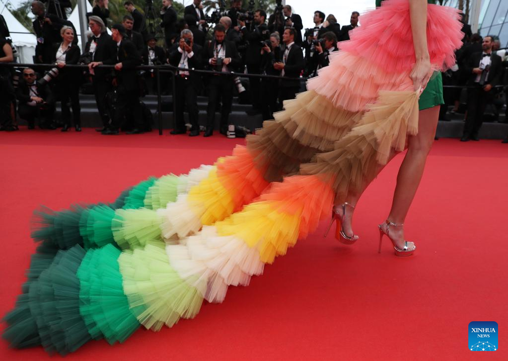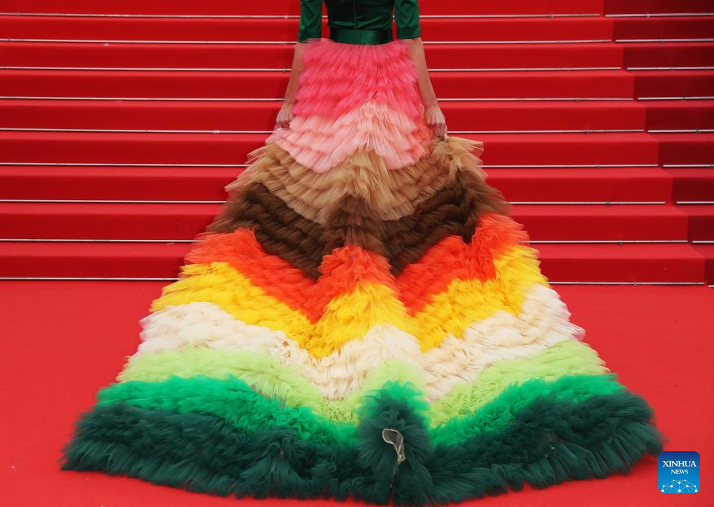 A guest arrives for the opening ceremony of the 76th edition of the Cannes Film Festival in Cannes, southern France, on May 16, 2023. The 76th edition of the Cannes Film Festival kicked off on Tuesday evening, with 21 films selected to compete for the Palme d'Or top prize. (Xinhua/Gao Jing)