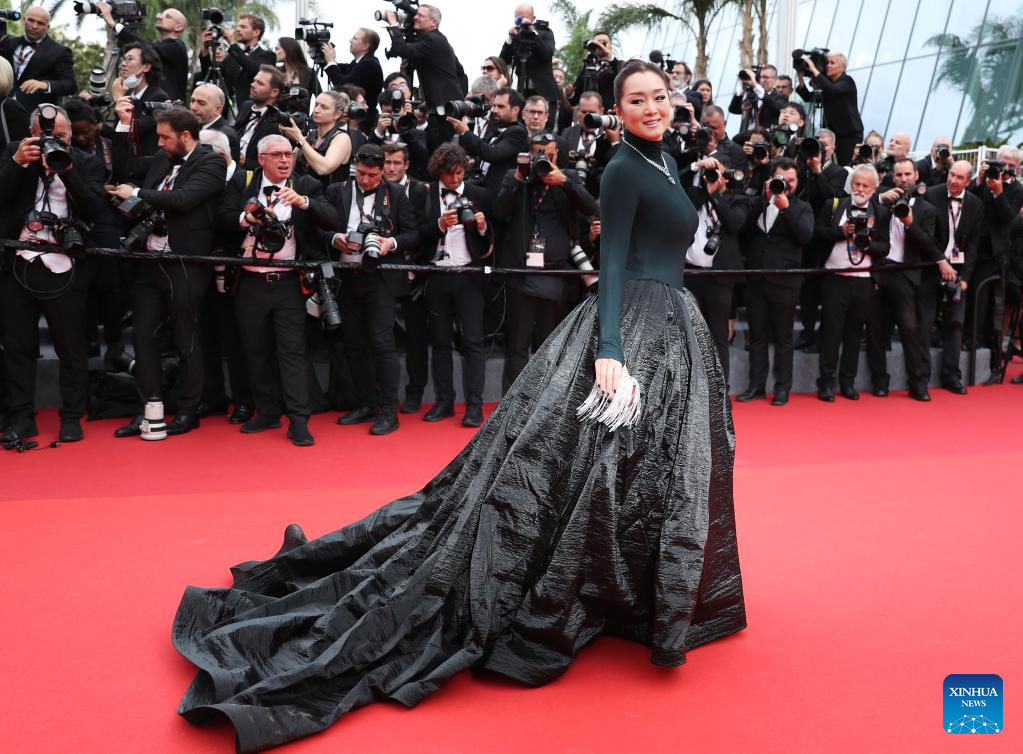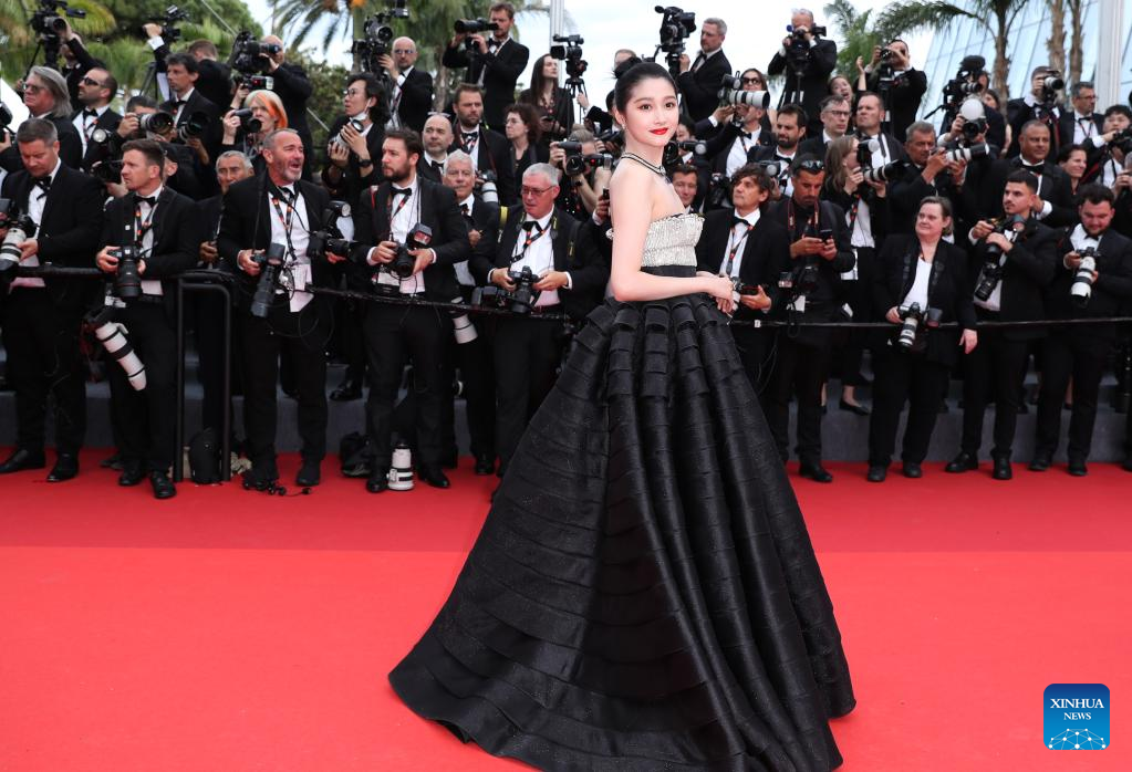Actress Guan Xiaotong arrives for the opening ceremony of the 76th edition of the Cannes Film Festival in Cannes, southern France, on May 16, 2023. The 76th edition of the Cannes Film Festival kicked off on Tuesday evening, with 21 films selected to compete for the Palme d'Or top prize. (Xinhua/Gao Jing)