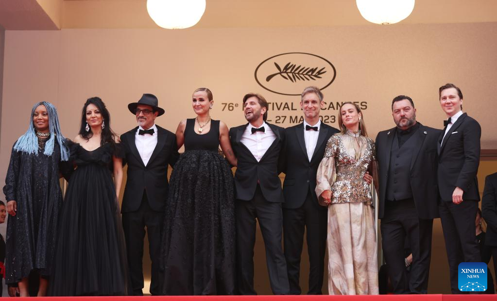 Swedish director and President of the Jury of the 76th Cannes Film Festival Ruben Ostlund (4th R, front) poses with members of the main competition jury for the opening ceremony of the 76th edition of the Cannes Film Festival in Cannes, southern France, on May 16, 2023. The 76th edition of the Cannes Film Festival kicked off on Tuesday evening, with 21 films selected to compete for the Palme d'Or top prize. (Xinhua/Gao Jing)