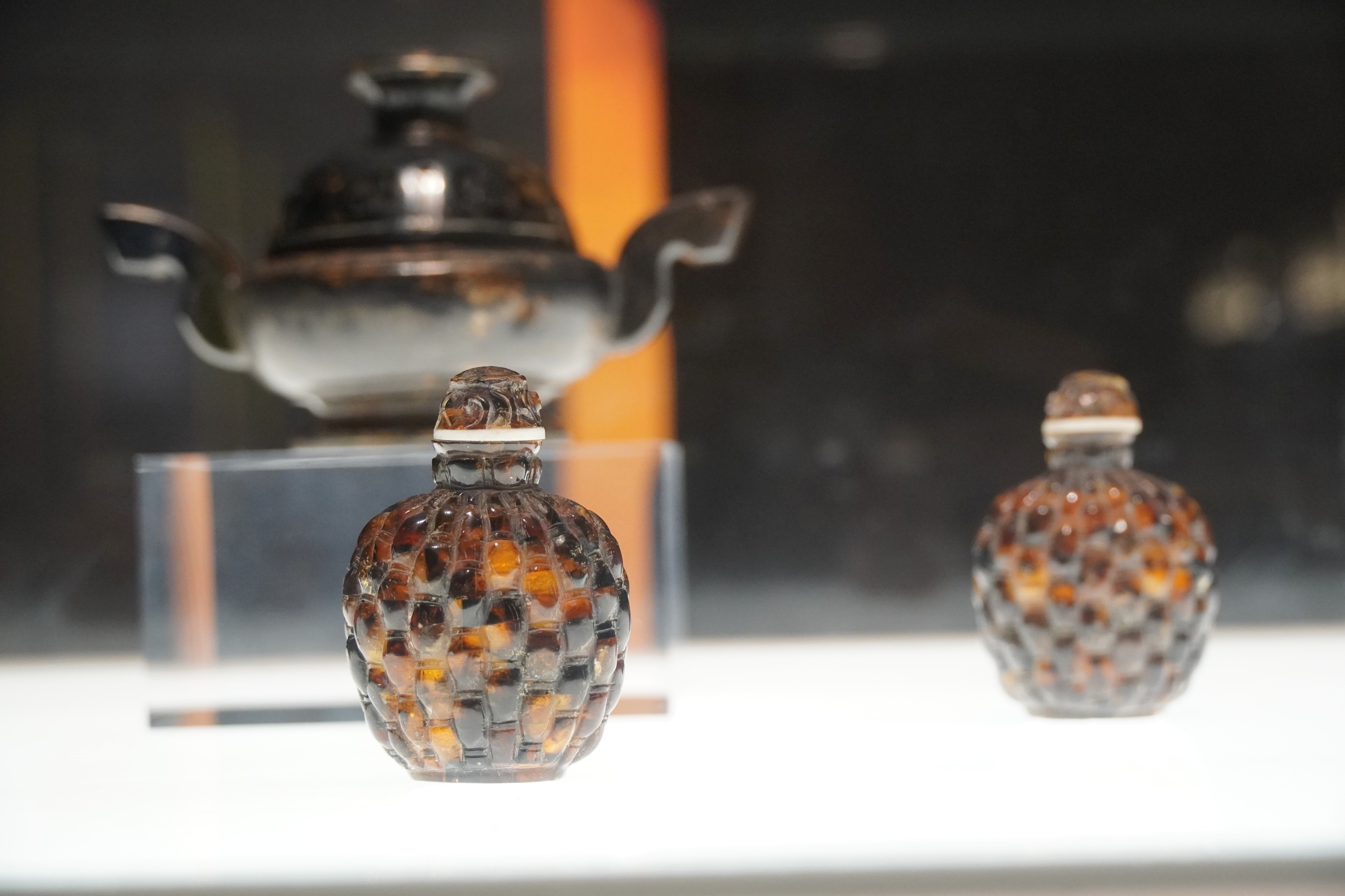 Photo shows amber artworks on display at the Guangdong Museum in Guangzhou city, south China's Guangdong Province. The amber artworks, which are from Fushun city, northeast China's Liaoning Province, date back around 50 million years. (Photo/Wang Yadie)