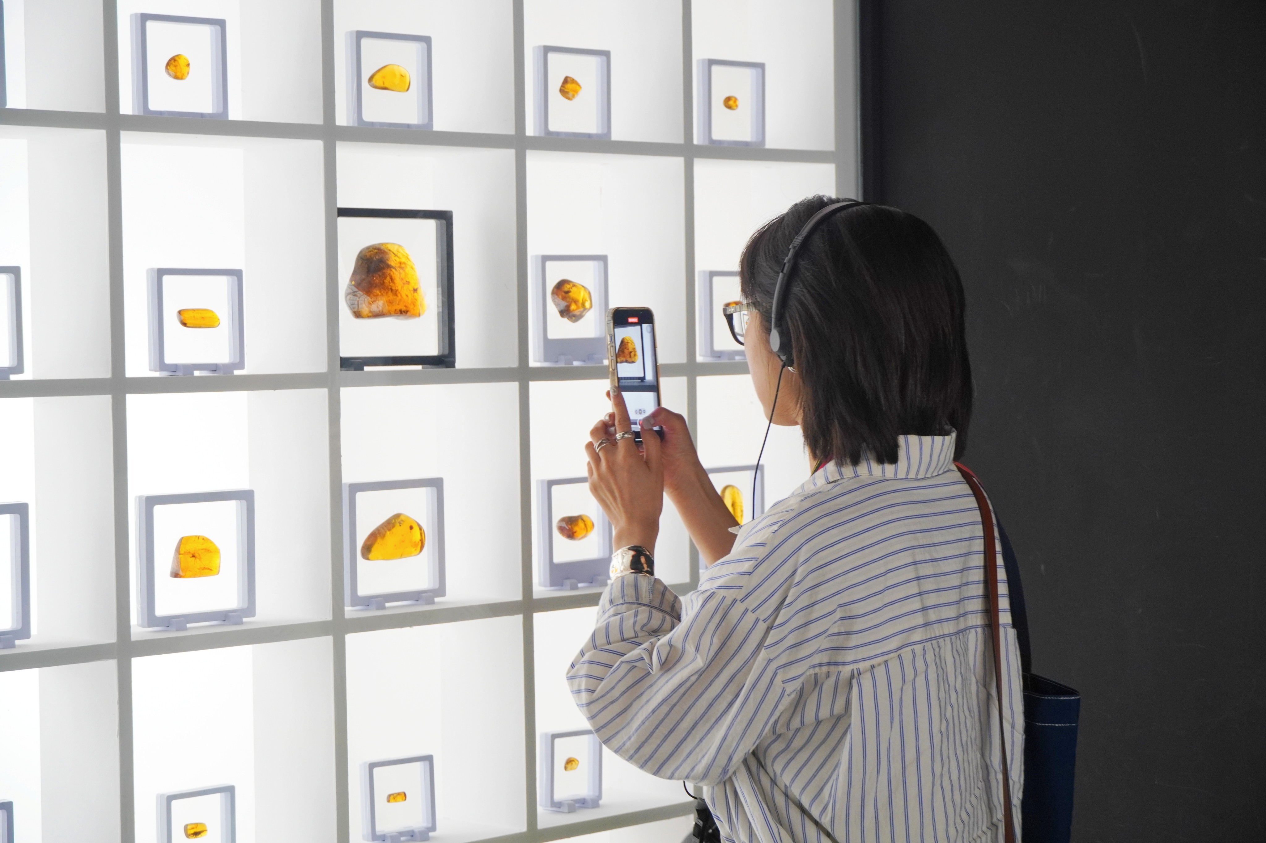 A visitor takes pictures of amber fossils during an exhibition at the Guangdong Museum in Guangzhou city, south China's Guangdong Province. (Photo/Wang Yadie)