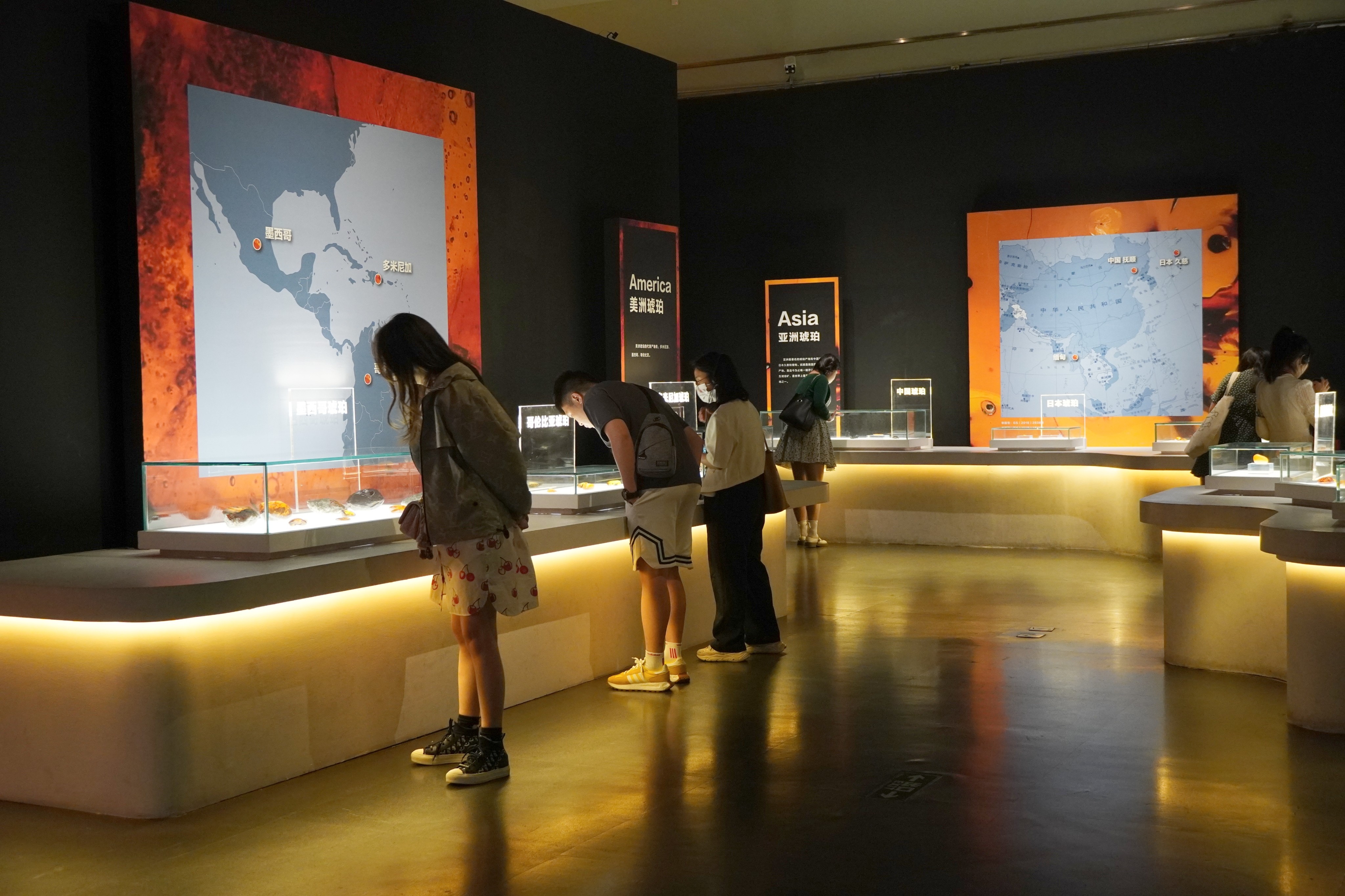 Visitors look at amber fossils during an exhibition at the Guangdong Museum in Guangzhou city, south China's Guangdong Province. (Photo/Wang Yadie)