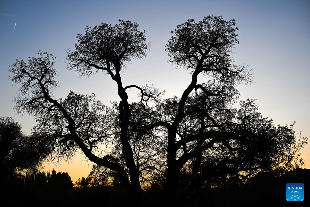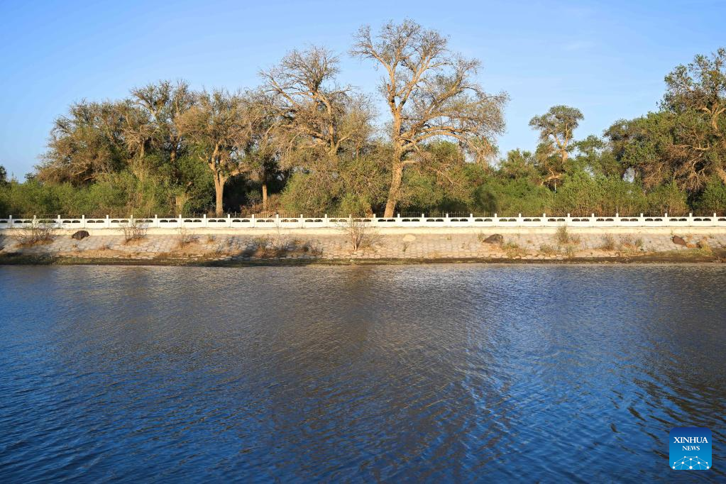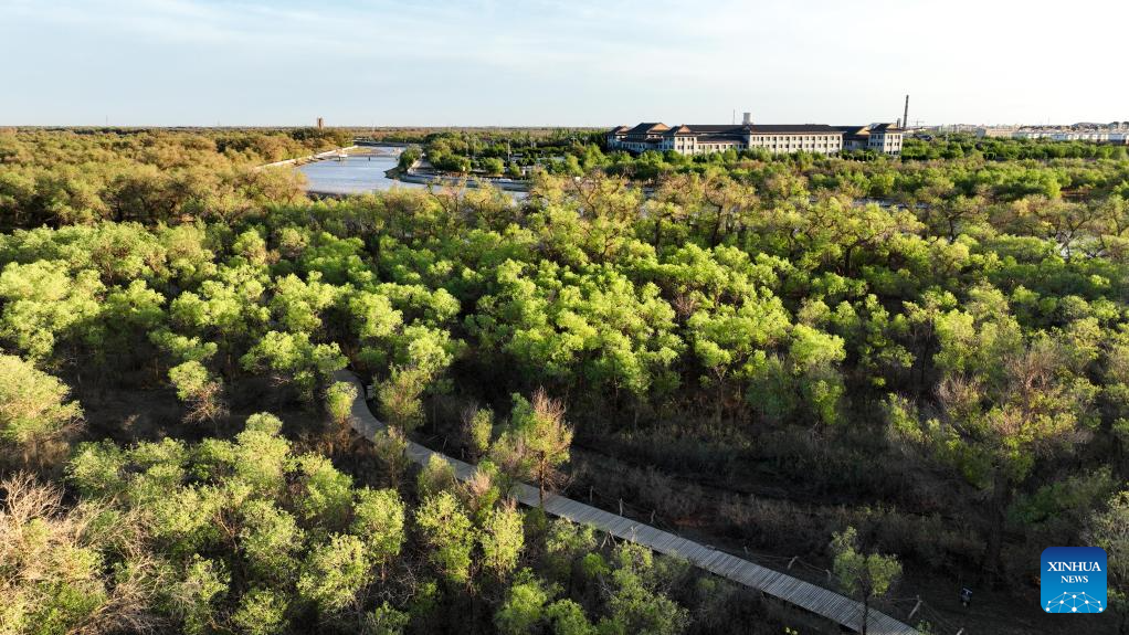 This photo taken on May 16, 2023 shows a view of the desert poplar (populus euphratica) forest in Ejina Banner of Alxa League, north China's Inner Mongolia Autonomous Region. (Xinhua/Bei He)