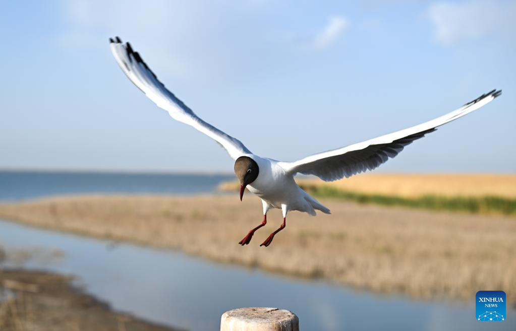 A relict gull flies over the Juyan Lake in Ejina Banner of Alxa League, north China's Inner Mongolia Autonomous Region, May 17, 2023. (Xinhua/Bei He)
