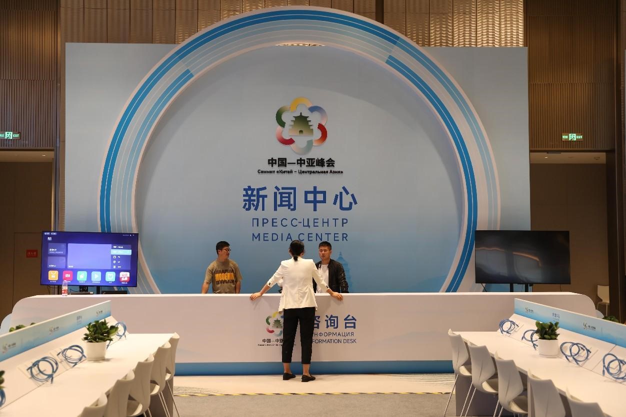 Photo shows the information desk of the media center of the China-Central Asia Summit. (People's Daily/Zhang Penghui)