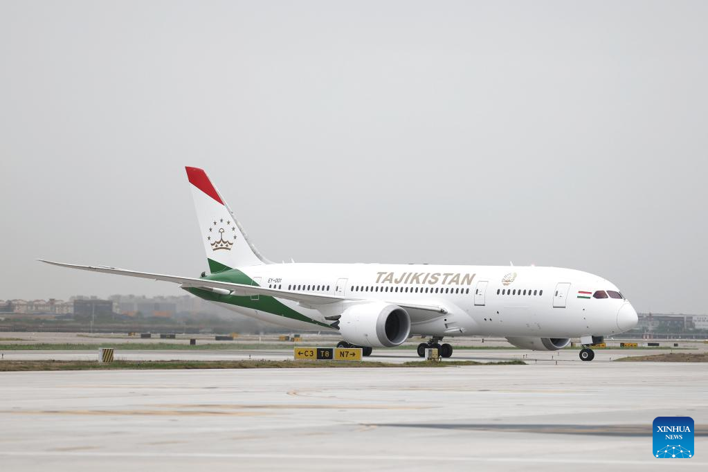 The plane of Tajik President Emomali Rahmon arrives in Xi'an, northwest China's Shaanxi Province, on May 17, 2023. Tajik President Emomali Rahmon arrived in Xi'an on Wednesday afternoon for the China-Central Asia Summit, which is scheduled for May 18 and 19. (Xinhua/Xing Guangli)