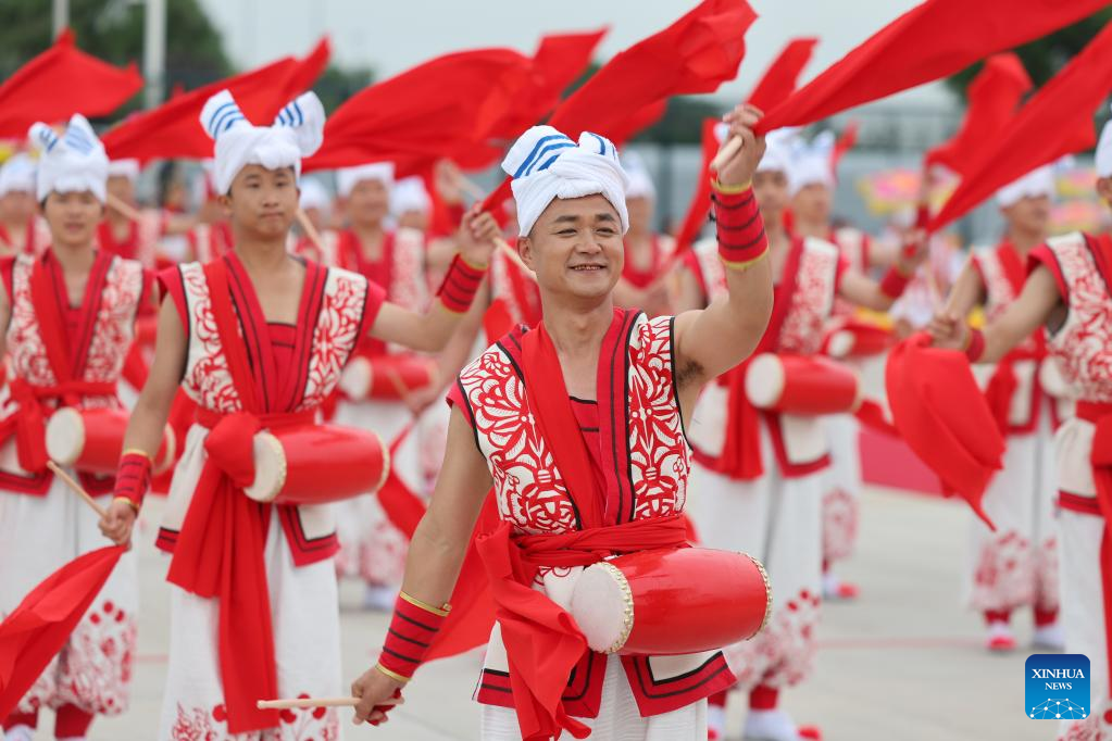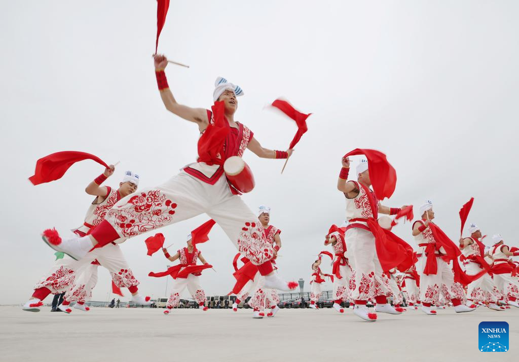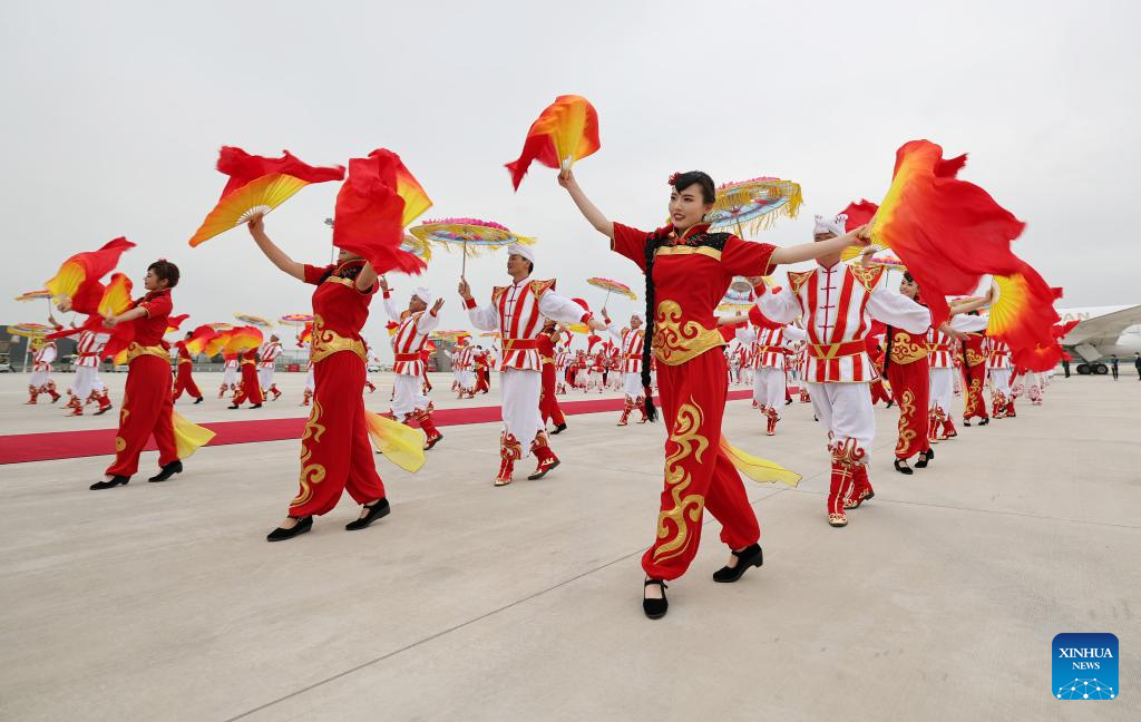 Shaanxi folk dancers perform during a welcoming ceremony for Tajik President Emomali Rahmon in Xi'an, northwest China's Shaanxi Province, on May 17, 2023. Tajik President Emomali Rahmon arrived in Xi'an on Wednesday afternoon for the China-Central Asia Summit, which is scheduled for May 18 and 19. (Xinhua/Xing Guangli)