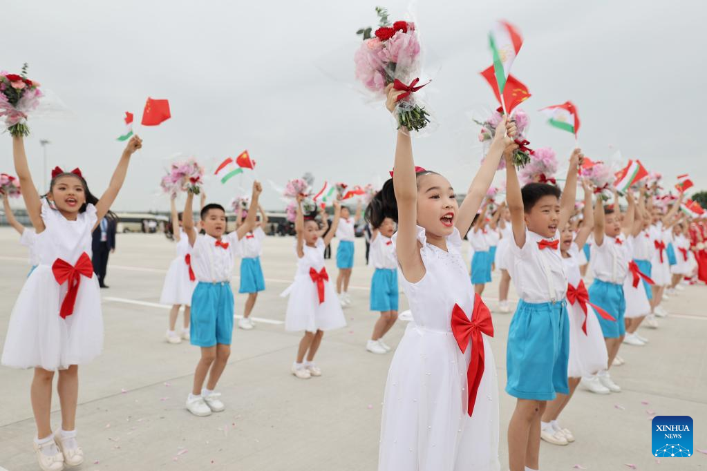 Children welcome the arriving of Tajik President Emomali Rahmon in Xi'an, northwest China's Shaanxi Province, on May 17, 2023. Tajik President Emomali Rahmon arrived in Xi'an on Wednesday afternoon for the China-Central Asia Summit, which is scheduled for May 18 and 19. (Xinhua/Xing Guangli)