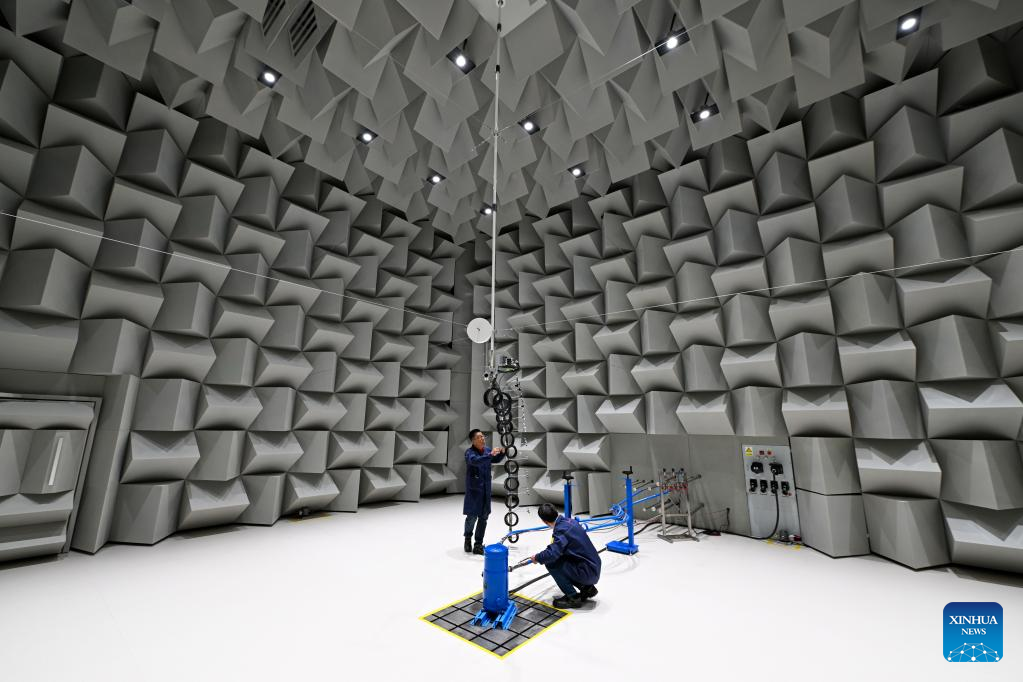 This photo taken on May 10, 2023 shows staff members working at a testing room at the Danfoss Global Green Refrigerants Compressors Laboratory in Tianjin, north China. (Xinhua/Sun Fanyue)