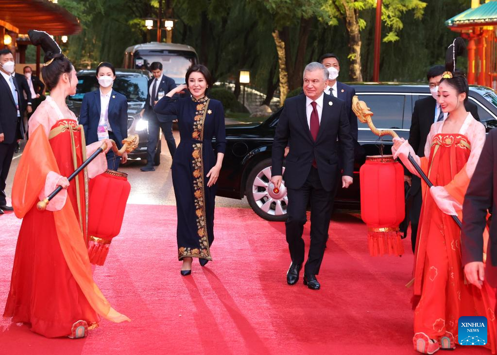 Uzbek President Shavkat Mirziyoyev and his wife arrive at a welcome ceremony for Central Asian leaders and their wives attending the China-Central Asia Summit in the Tang Paradise in Xi'an, northwest China's Shaanxi Province, May 18, 2023. (Xinhua/Xu Zijian)