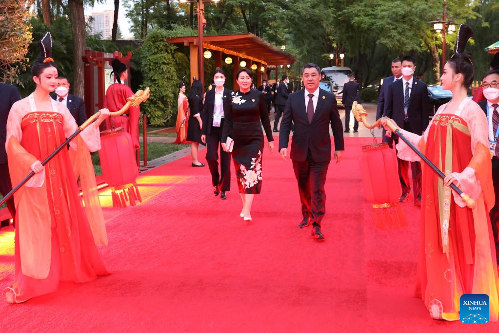 Kyrgyz President Sadyr Japarov and his wife arrive at a welcome ceremony for Central Asian leaders and their wives attending the China-Central Asia Summit in the Tang Paradise in Xi'an, northwest China's Shaanxi Province, May 18, 2023. (Xinhua/Xu Zijian)