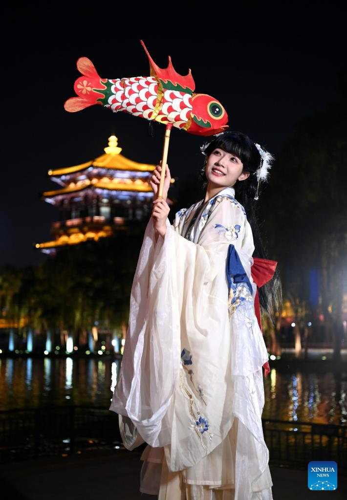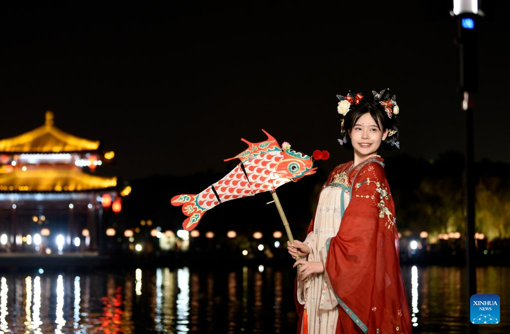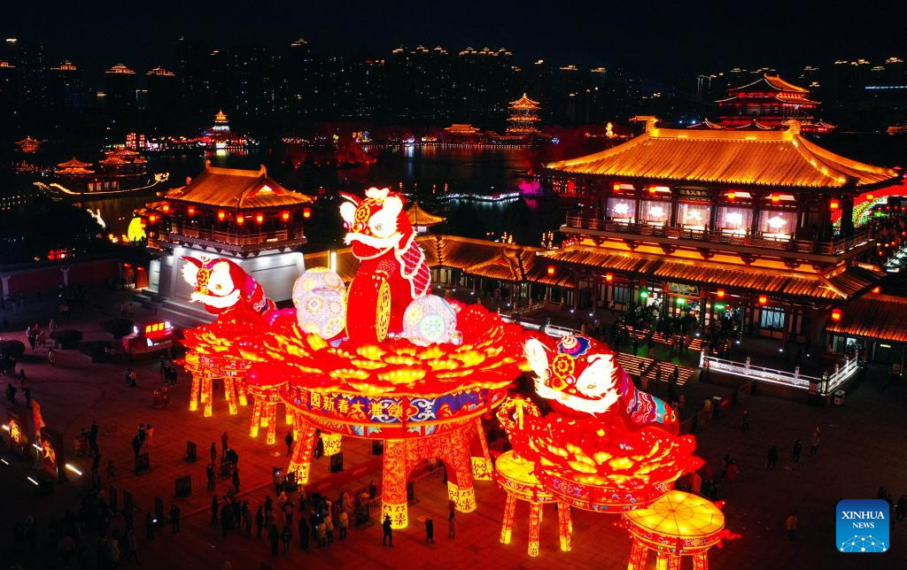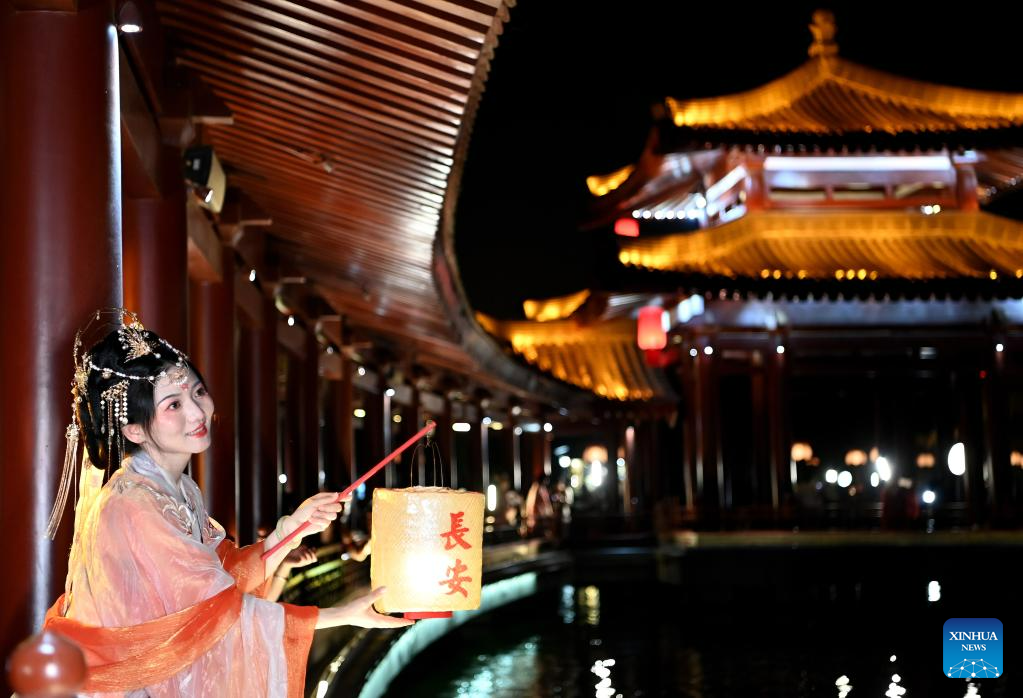 This photo taken on Jan. 24, 2023 shows the night view of the Tang Paradise in Xi'an, northwest China's Shaanxi Province. The Tang Paradise, located in the south of Xi'an, is a large cultural theme park showing the life style of the prosperous Tang Dynasty (618-907). (Xinhua/Liu Xiao)