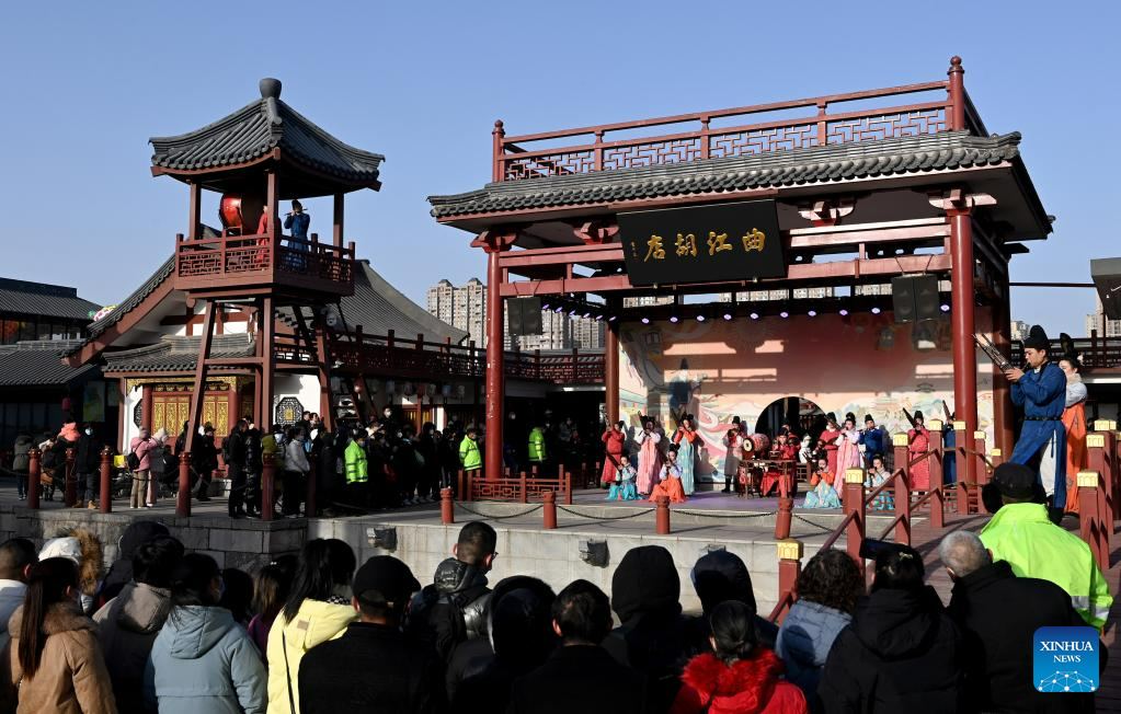 Actors perform at the Tang Paradise in Xi'an, northwest China's Shaanxi Province, Jan. 24, 2023. The Tang Paradise, located in the south of Xi'an, is a large cultural theme park showing the life style of the prosperous Tang Dynasty (618-907). (Xinhua/Liu Xiao)