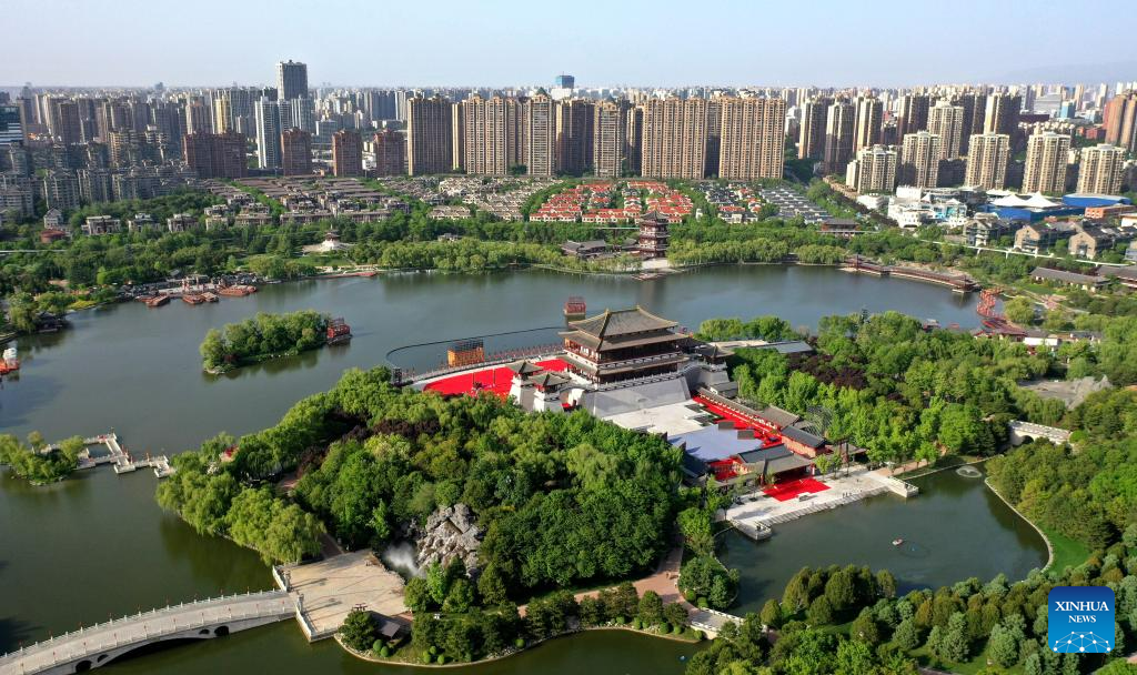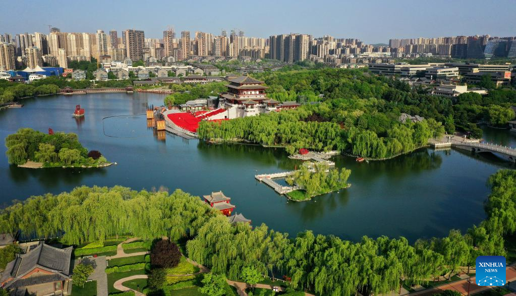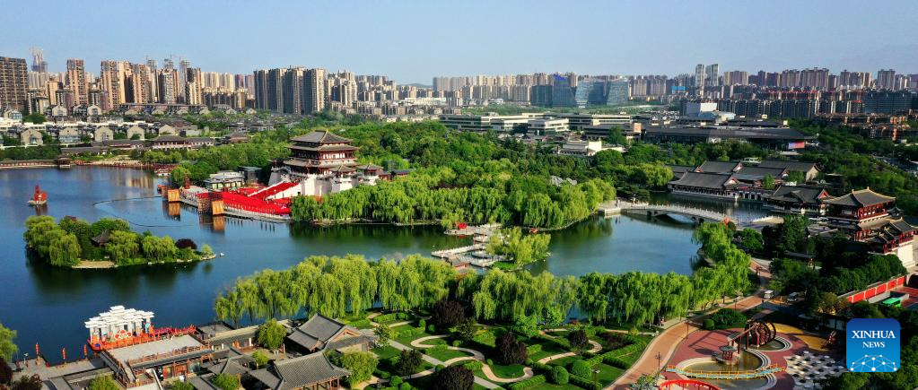 This aerial photo taken on April 19, 2023 shows the view of the Tang Paradise in Xi'an, northwest China's Shaanxi Province. The Tang Paradise, located in the south of Xi'an, is a large cultural theme park showing the life style of the prosperous Tang Dynasty (618-907). (Xinhua/Liu Xiao)