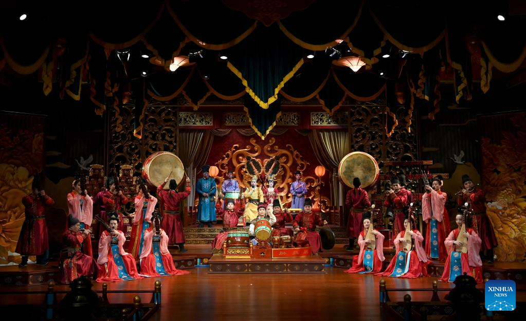 Actors perform Qinqiang Opera at the Tang Paradise in Xi'an, northwest China's Shaanxi Province, Feb. 5, 2023. The Tang Paradise, located in the south of Xi'an, is a large cultural theme park showing the life style of the prosperous Tang Dynasty (618-907). (Xinhua/Liu Xiao)