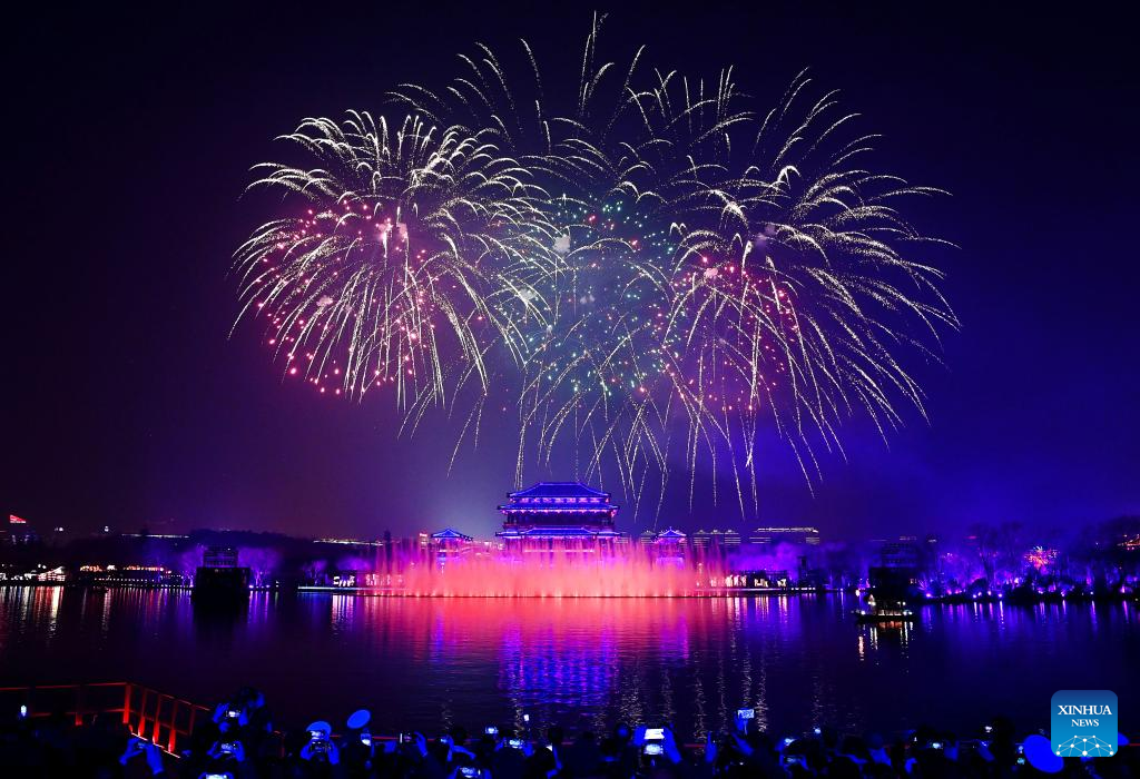 Tourists watch fireworks at the Tang Paradise in Xi'an, northwest China's Shaanxi Province, Feb. 5, 2023. The Tang Paradise, located in the south of Xi'an, is a large cultural theme park showing the life style of the prosperous Tang Dynasty (618-907). (Xinhua/Liu Xiao)