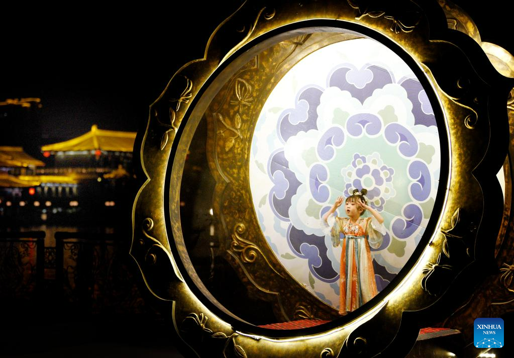 A child visits the Tang Paradise in Xi'an, northwest China's Shaanxi Province, April 19, 2023. The Tang Paradise, located in the south of Xi'an, is a large cultural theme park showing the life style of the prosperous Tang Dynasty (618-907). (Xinhua/Liu Xiao)