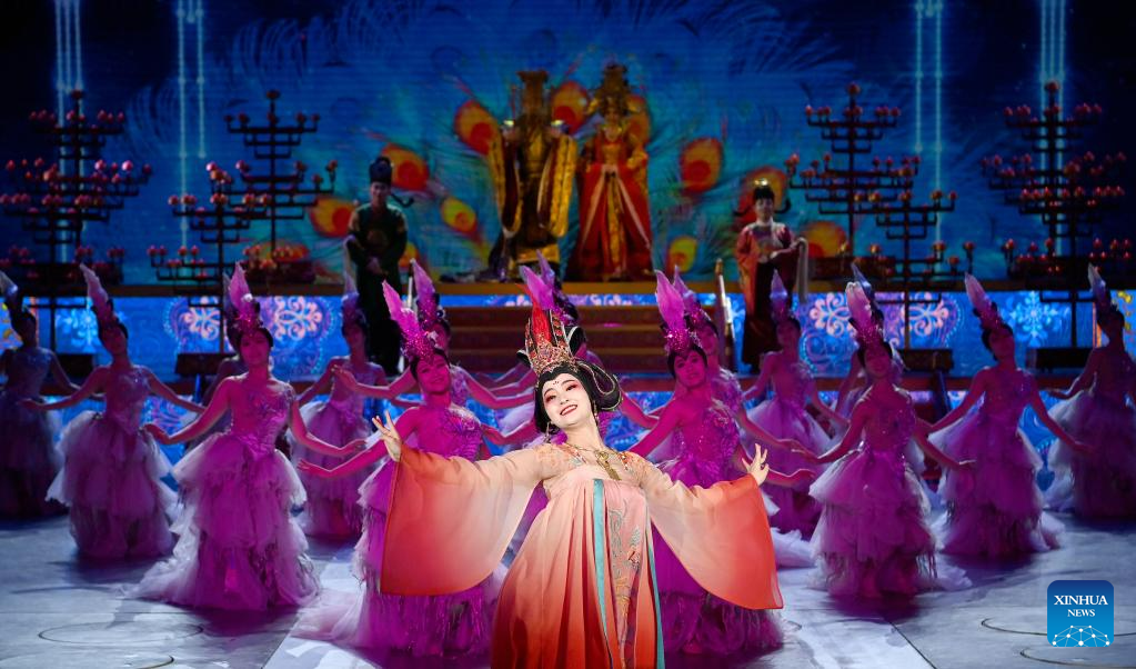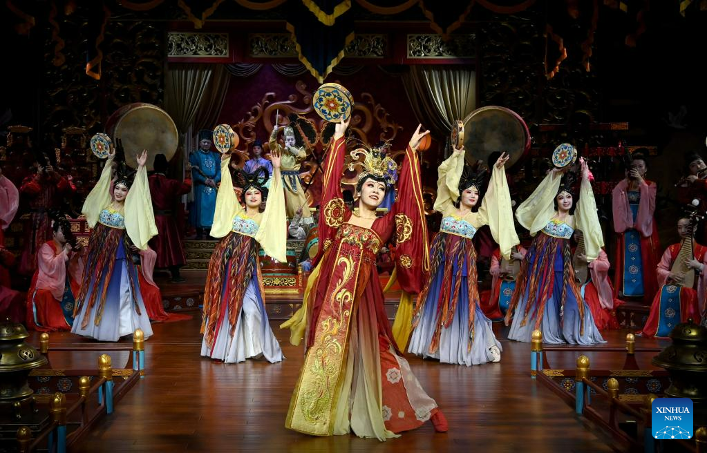 Dancers perform dance drama at the Tang Paradise in Xi'an, northwest China's Shaanxi Province, Jan. 24, 2023. The Tang Paradise, located in the south of Xi'an, is a large cultural theme park showing the life style of the prosperous Tang Dynasty (618-907). (Xinhua/Liu Xiao)