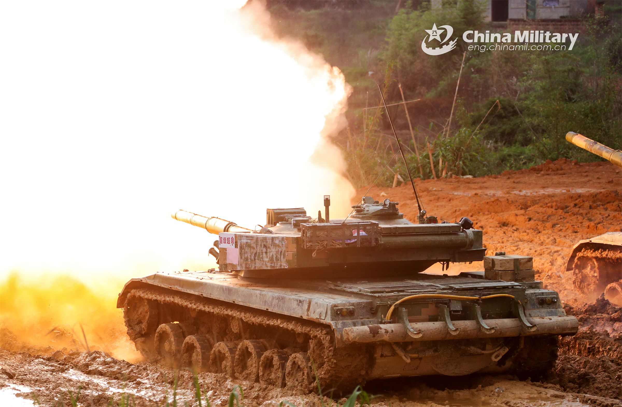 A main battle tank attached to a brigade under the PLA 72nd Group Army fires at fixed targets during a recent live-fire training exercise. (eng.chinamil.com.cn/Photo by Xiao Yuxuan)