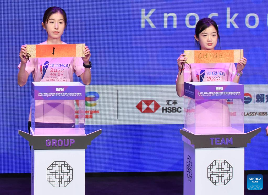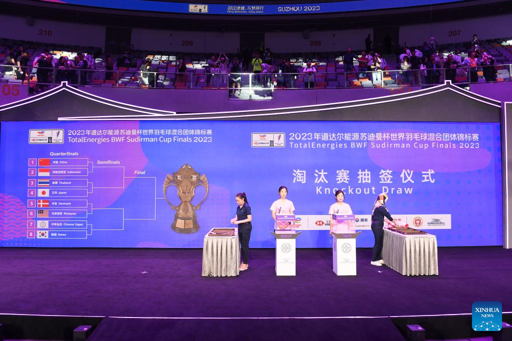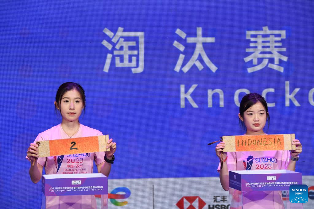 Staff members show the draw result during the knockout draw ceremony at BWF Sudirman Cup in Suzhou, east China's Jiangsu Province, May 18, 2023. (Xinhua/Hou Zhaokang)