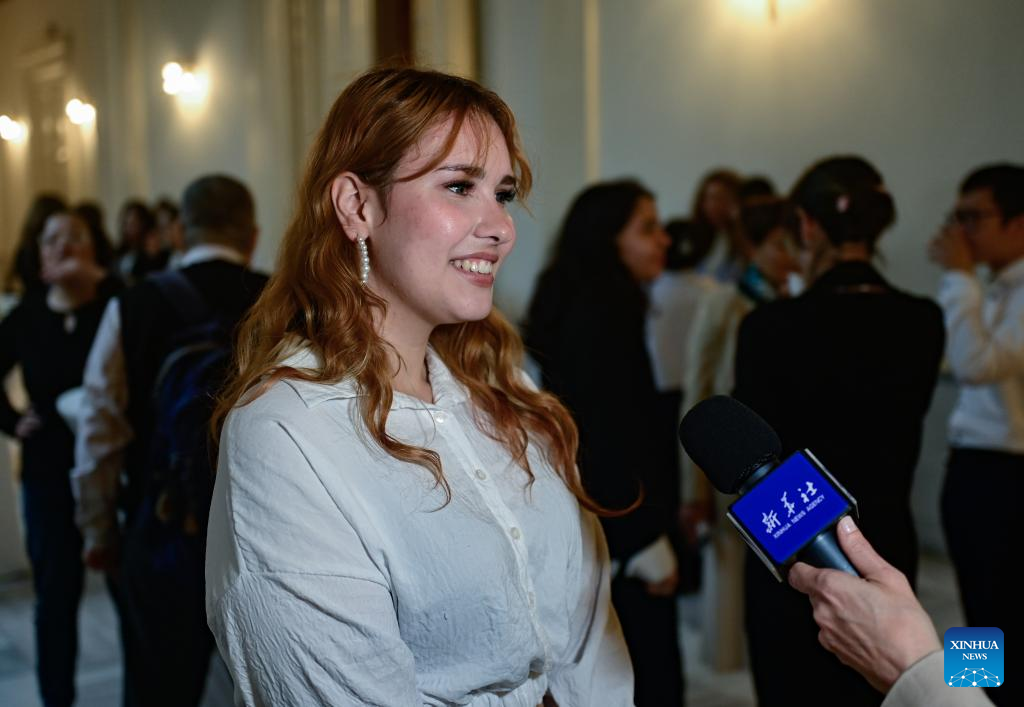 A student talks about her plan to be a cultural ambassador between China and Türkiye, in Istanbul, Trkiye, May 17, 2023. A total of 20 Turkish college students from Istanbul University were awarded a consul-general scholarship on Wednesday for their outstanding learning of the Chinese language. (Photo by Omer Kuscu/Xinhua)