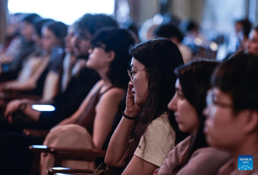 Participants of a sinology seminar at Istanbul University listen to academicians' speeches in Istanbul, Türkiye, May 17, 2023. A total of 20 Turkish college students from Istanbul University were awarded a consul-general scholarship on Wednesday for their outstanding learning of the Chinese language. (Photo by Omer Kuscu/Xinhua)