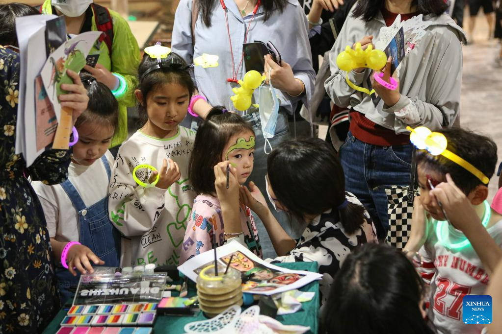 Children experience face painting at Shanghai Natural History Museum in Shanghai, east China, May 18, 2023. Shanghai Natural History Museum(SNHM) held a special event themed "Night at the SNHM" in celebration of the International Museum Day on Thursday. (Xinhua/Xin Mengchen)