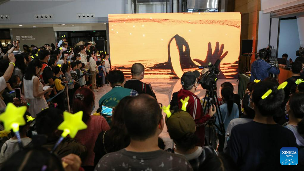 Visitors watch a sand painting show at Shanghai Natural History Museum in Shanghai, east China, May 18, 2023. Shanghai Natural History Museum(SNHM) held a special event themed "Night at the SNHM" in celebration of the International Museum Day on Thursday. (Xinhua/Xin Mengchen)