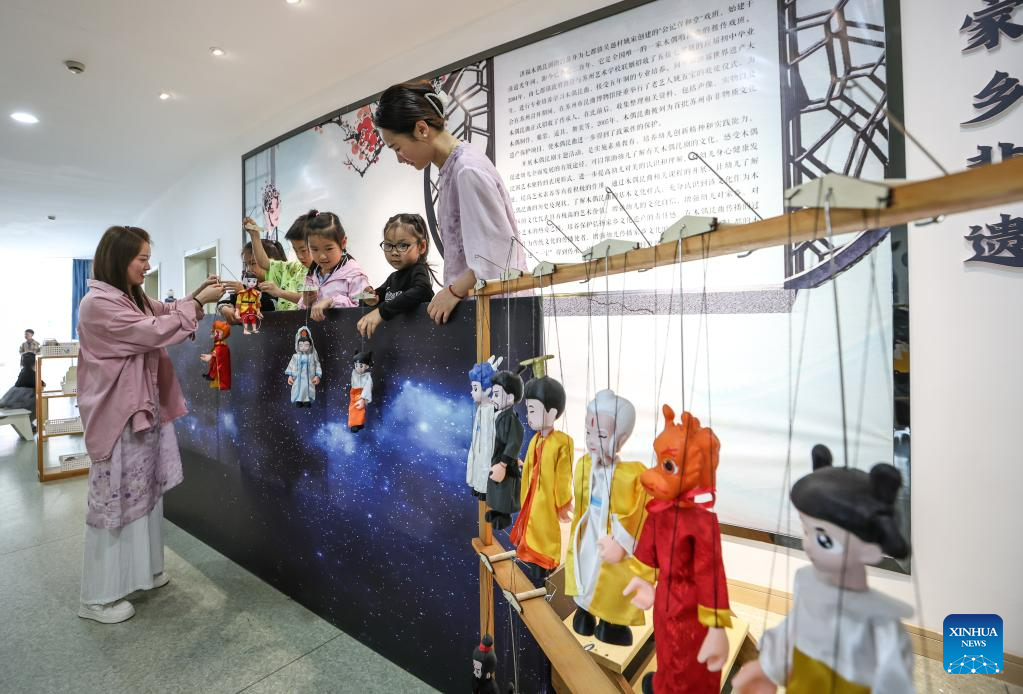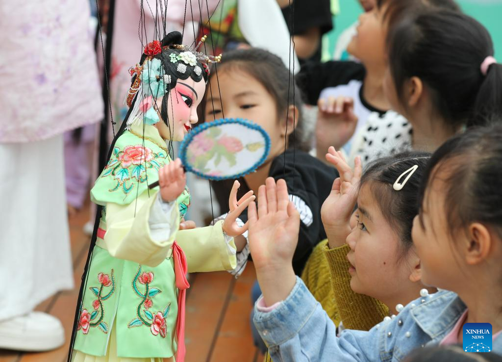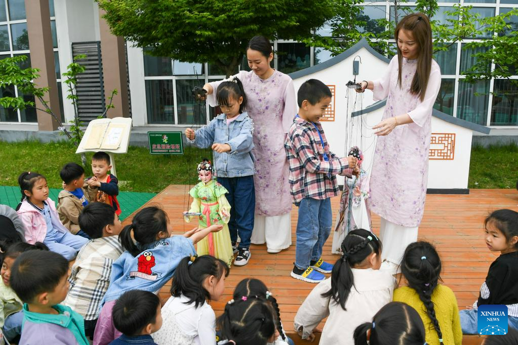 Children interact with puppets at a kindergarten in Qidu Town, Wujiang District of Suzhou City, east China's Jiangsu Province, April 20, 2023. Kunqu, with a history of hundreds of years, is listed by the United Nations Educational, Scientific and Cultural Organization (UNESCO) as an intangible cultural heritage in 2001. (Xinhua/Yang Lei)