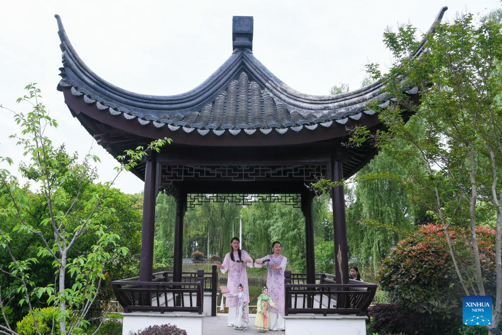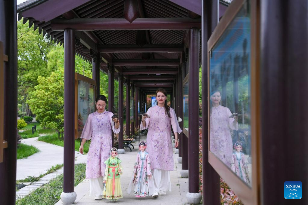 Sun Jing and Shi Jinfang rehearse puppet play of Kunqu Opera at a park in Qidu Town, Wujiang District of Suzhou City, east China's Jiangsu Province, April 18, 2023. Kunqu, with a history of hundreds of years, is listed by the United Nations Educational, Scientific and Cultural Organization (UNESCO) as an intangible cultural heritage in 2001. (Xinhua/Li Bo)
