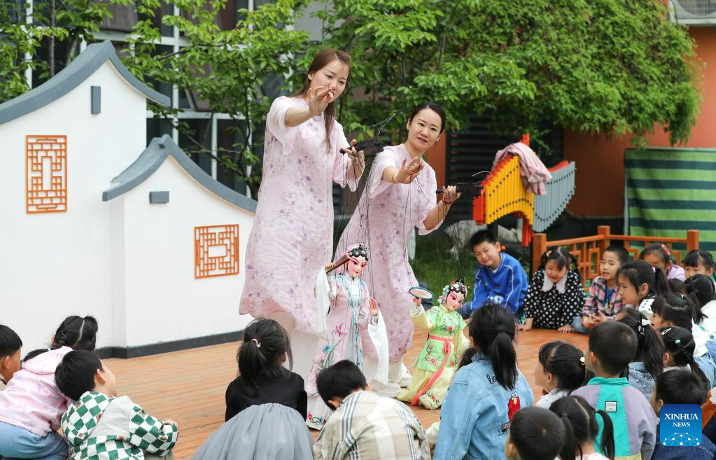 Sun Jing (R) and Shi Jinfang perform puppet play of Kunqu Opera for children at a kindergarten in Qidu Town, Wujiang District of Suzhou City, east China's Jiangsu Province, April 20, 2023. Kunqu, with a history of hundreds of years, is listed by the United Nations Educational, Scientific and Cultural Organization (UNESCO) as an intangible cultural heritage in 2001. (Xinhua/Yang Lei)