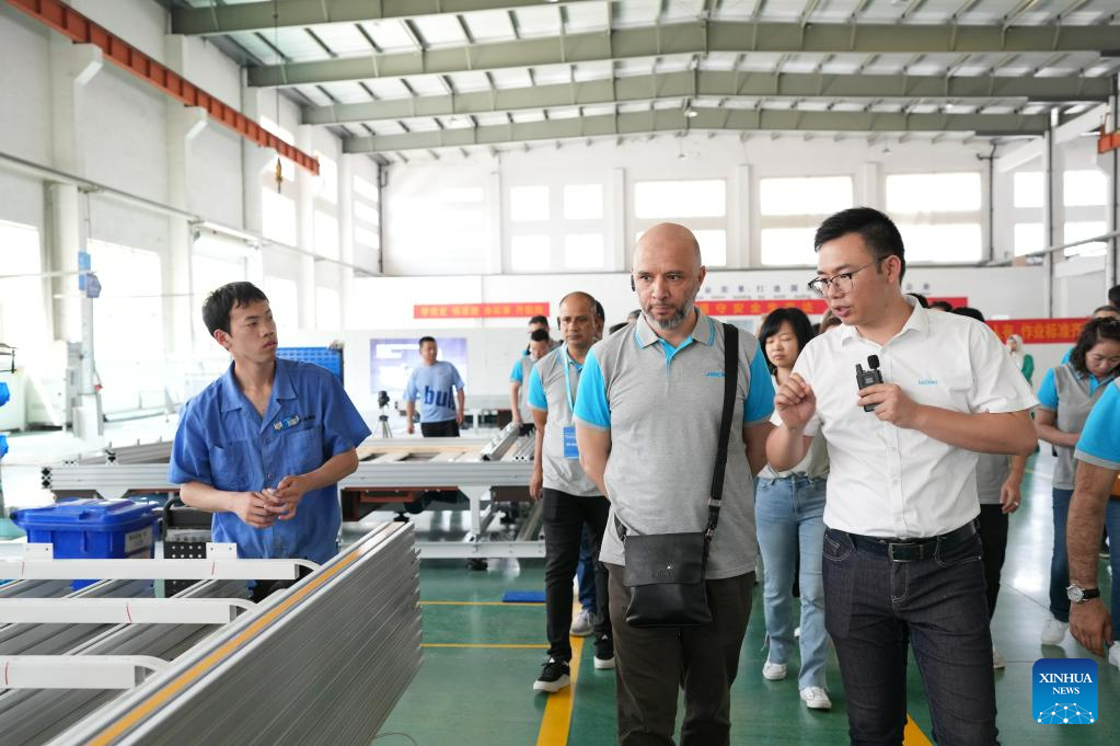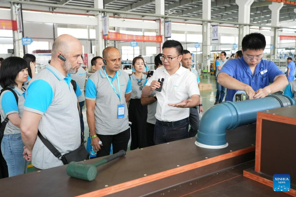 Representatives of foreign dealers visit a production line at the TopCut-Bullmer Co., Ltd in Linhai, east China's Zhejiang Province, May 18, 2023. Bullmer, a German company founded in 1933, celebrated its 90th founding anniversary in Linhai on Thursday. (Xinhua/Weng Xinyang)