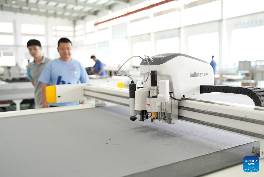 Workers test a new-type cut-bed at the TopCut-Bullmer Co., Ltd in Linhai, east China's Zhejiang Province, May 18, 2023. Bullmer, a German company founded in 1933, celebrated its 90th founding anniversary in Linhai on Thursday. (Xinhua/Weng Xinyang)