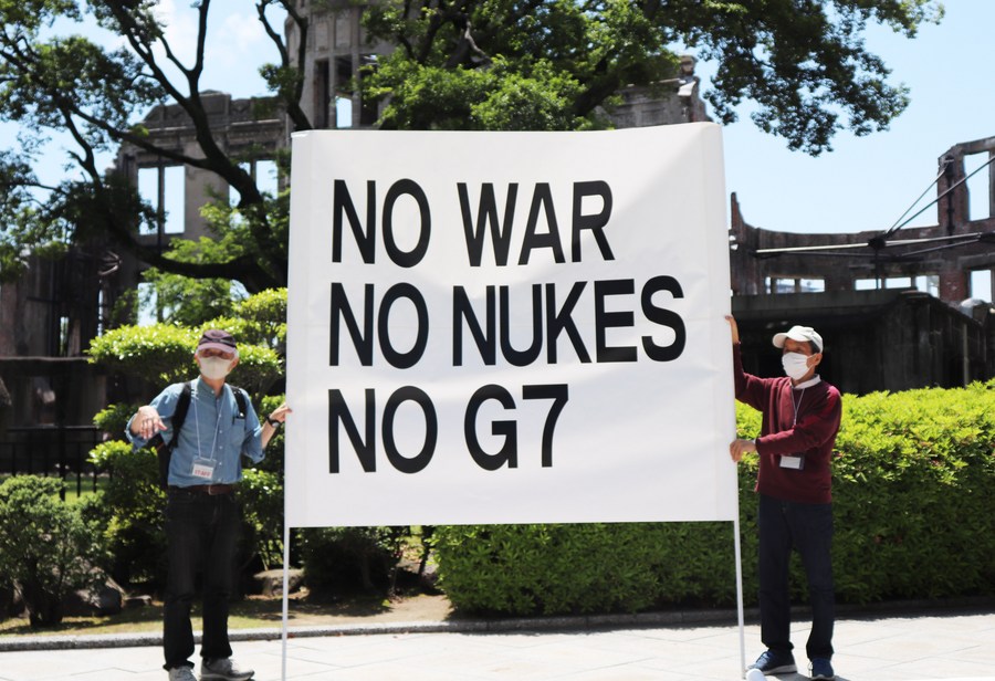 Protesters rally at the Hiroshima Peace Memorial Park in a protest against the upcoming Group of Seven (G7) summit, in Hiroshima, Japan, May 18, 2023. (Xinhua/Zhang Xiaoyu)
