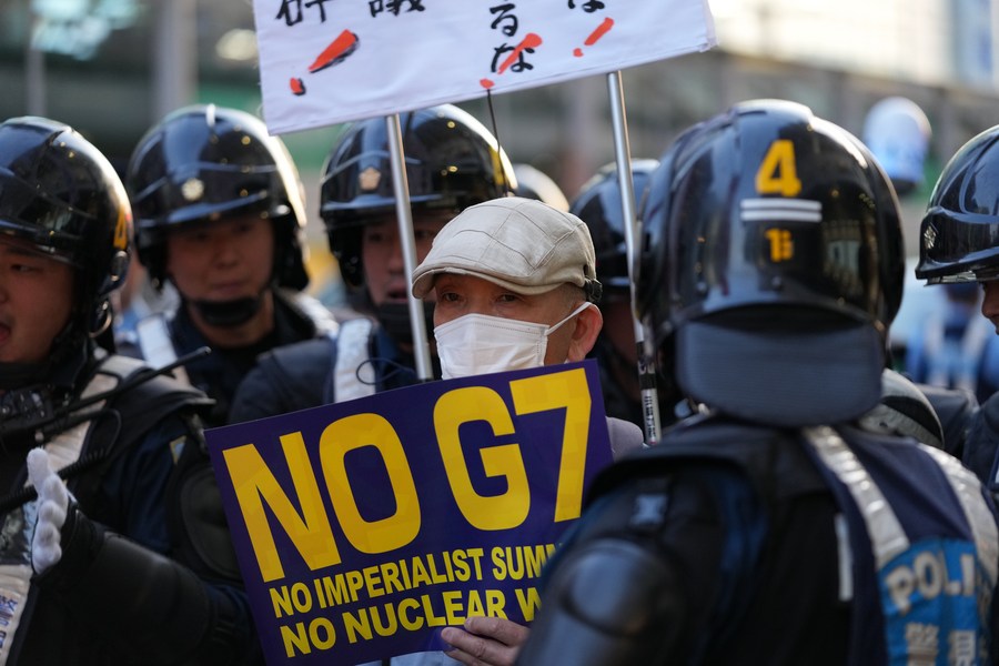 A man holding a banner protests against the upcoming Group of Seven (G7) summit, in Hiroshima, Japan, May 17, 2023. (Xinhua/Zhang Xiaoyu)