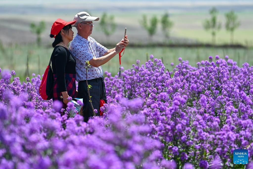 This photo taken on May 17, 2023 shows a view of a scenic spot in Huocheng County in Ili Kazak Autonomous Prefecture, northwest China's Xinjiang Uygur Autonomous Region. Ili Kazak Autonomous Prefecture has developed flowers sightseeing economy in recent years, which boosts the local tourism, attracts lots of visitors and increases the income of local people. (Xinhua/Ding Lei)