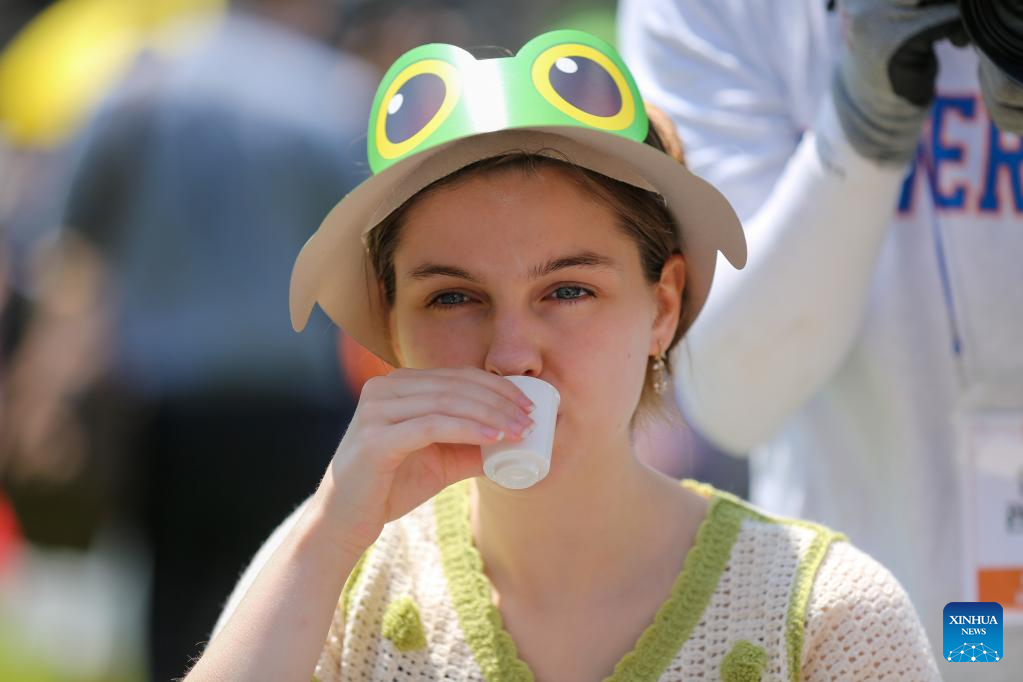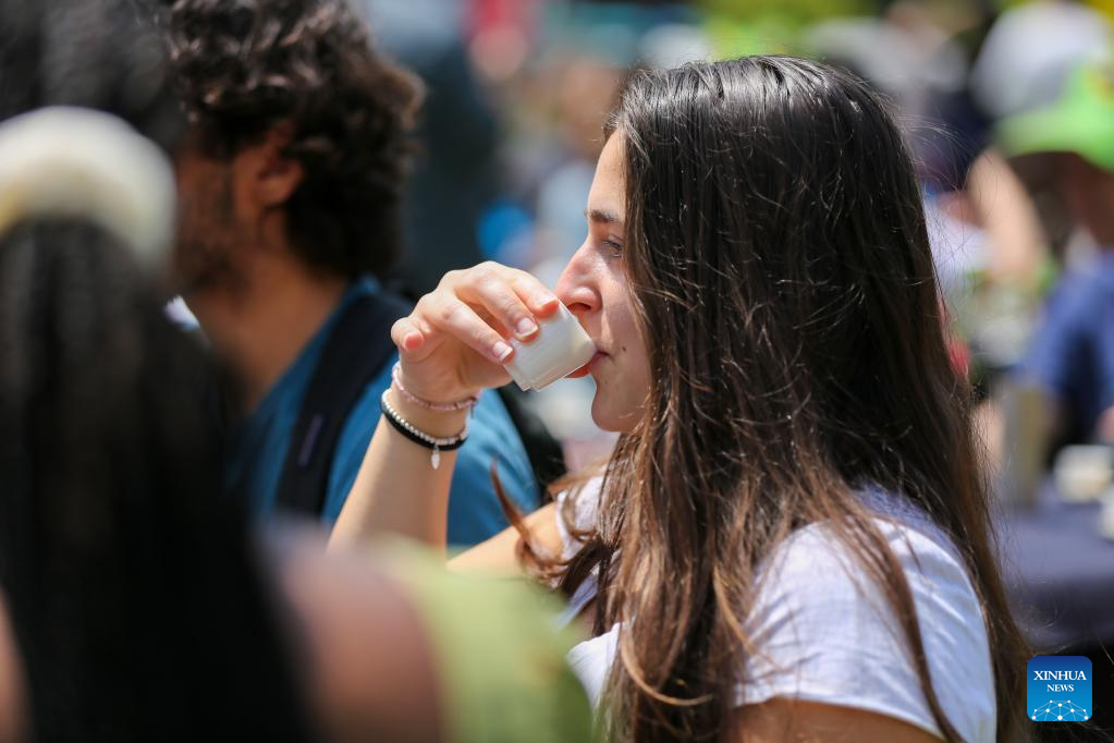 A tourist tastes Chinese tea in Seoul, South Korea, May 19, 2023. A series of events to promote Chinese tea culture was launched by the Chinese Cultural Center here on Friday to mark the upcoming International Tea Day. (Xinhua/Wang Yiliang)