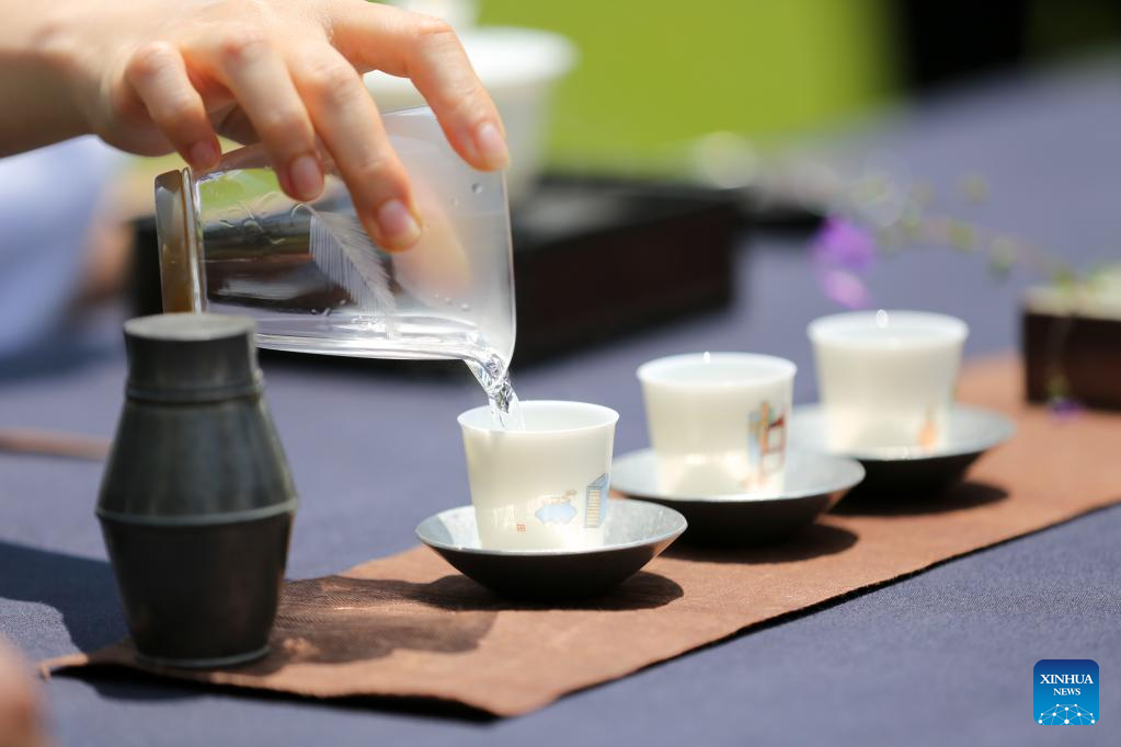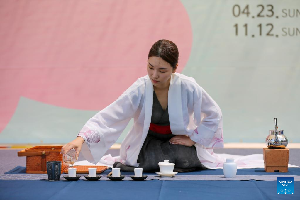 A tea art specialist performs in Seoul, South Korea, May 19, 2023. A series of events to promote Chinese tea culture was launched by the Chinese Cultural Center here on Friday to mark the upcoming International Tea Day. (Xinhua/Wang Yiliang)