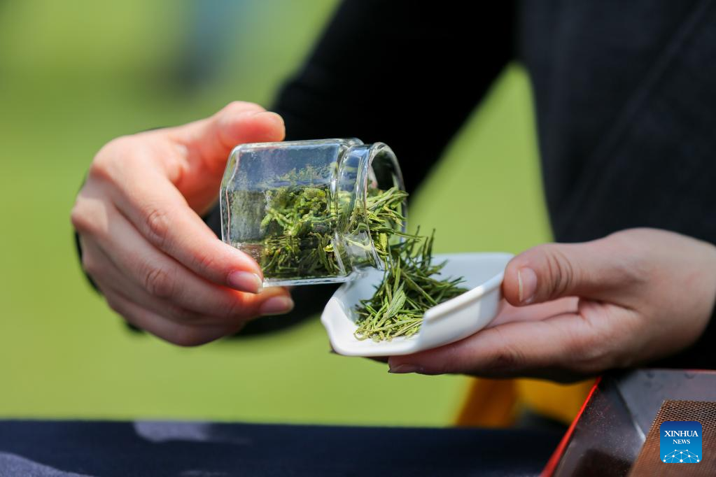 A tea art specialist shows Chinese green tea in Seoul, South Korea, May 19, 2023. A series of events to promote Chinese tea culture was launched by the Chinese Cultural Center here on Friday to mark the upcoming International Tea Day. (Xinhua/Wang Yiliang)