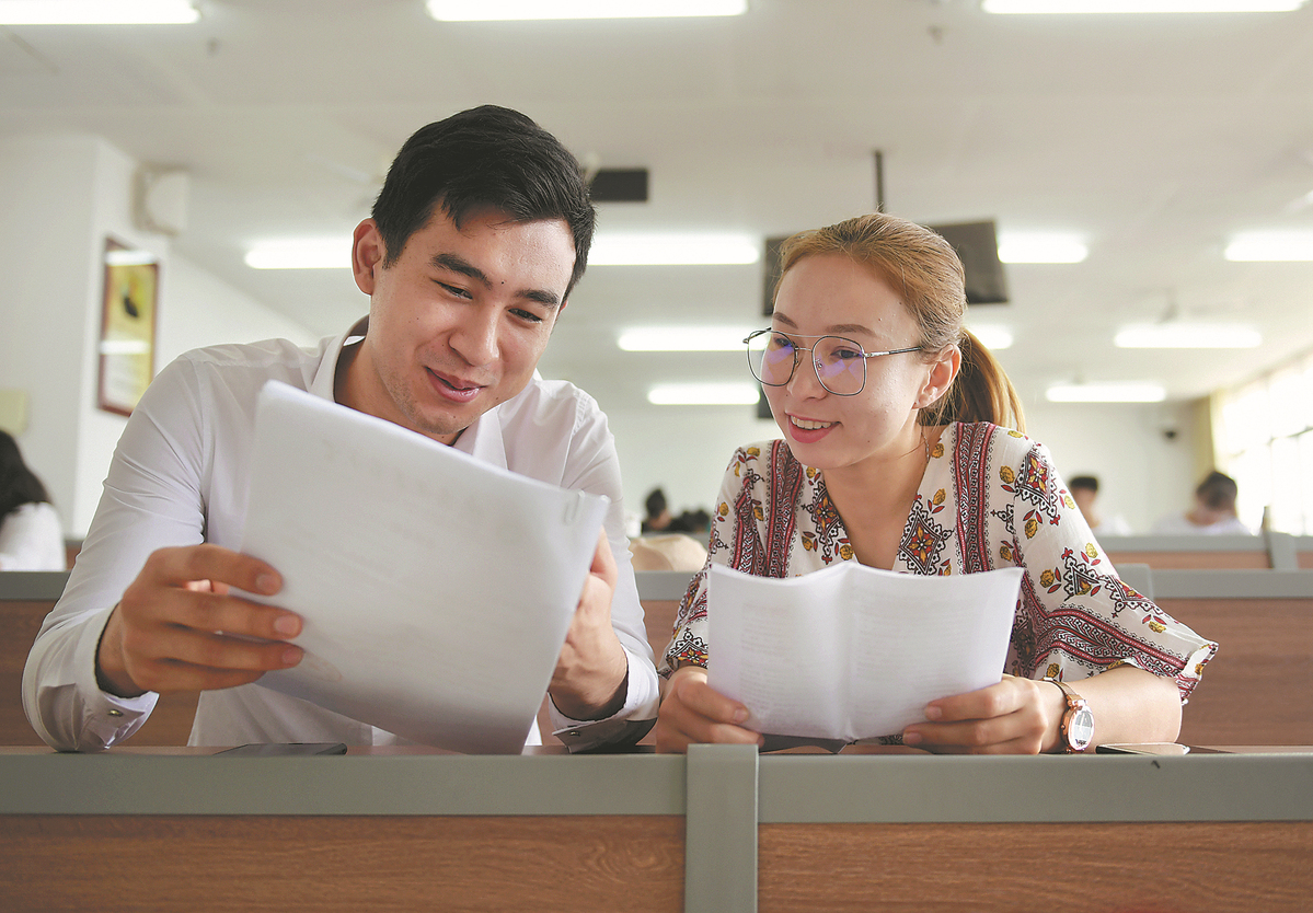 Two students from Kazakhstan discuss a thesis at a college in Xi'an, Shaanxi province. LI YIBO/XINHUA