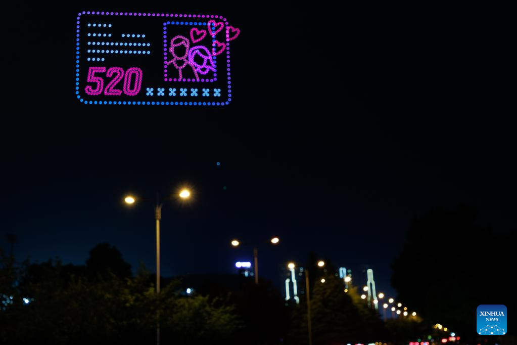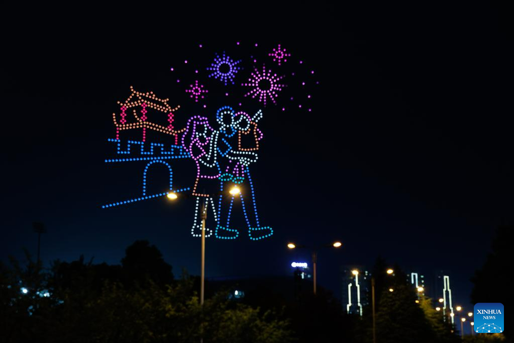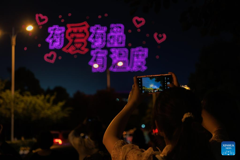 People take photos of a drone light show in Guiyang, southwest China's Guizhou Province, May 18, 2023. Altogether 1,000 drones performed a light show over Guiyang Thursday night. (Xinhua/Liu Xu)