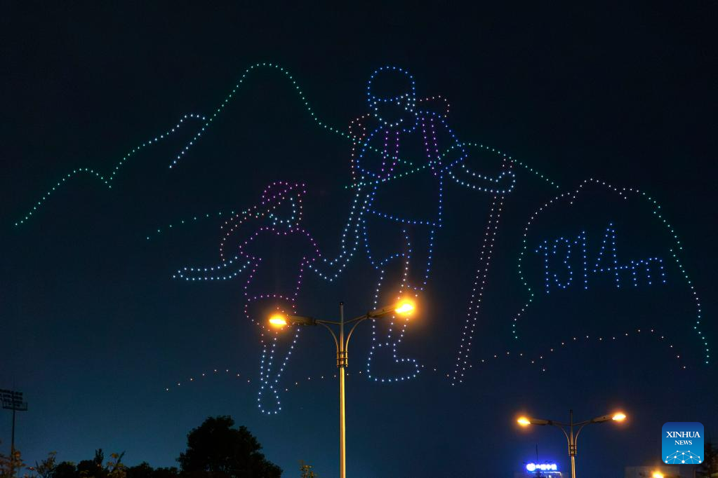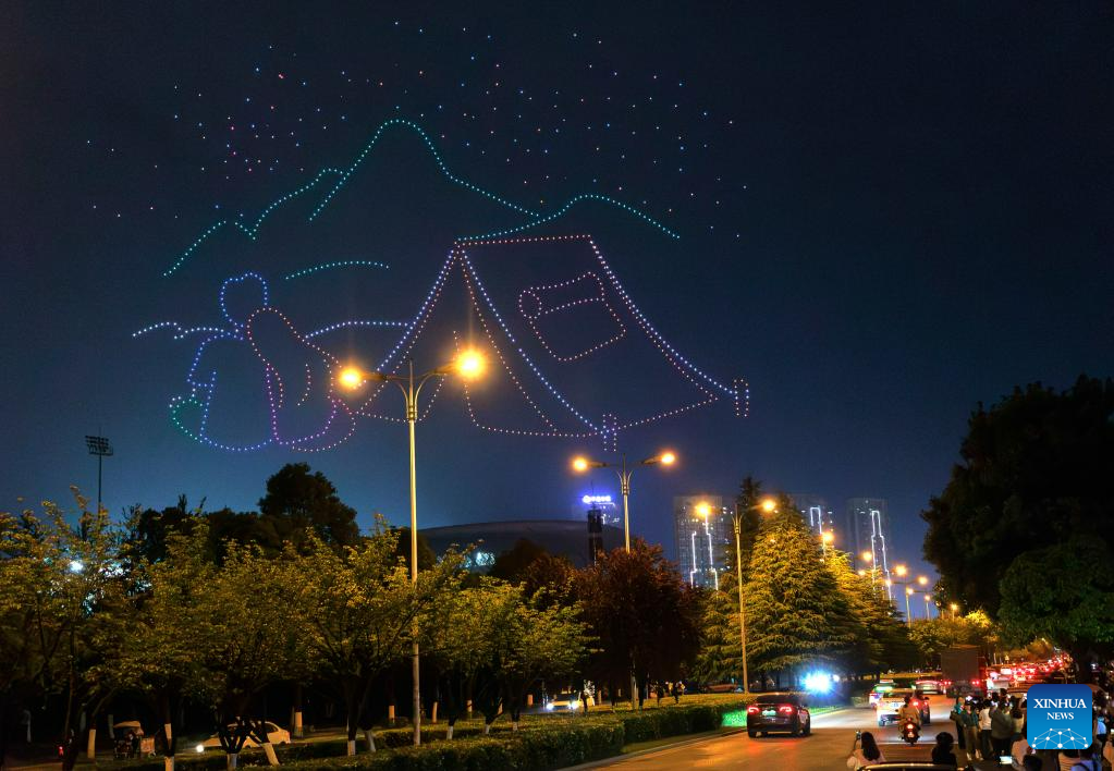 This photo taken on May 18, 2023 shows drones forming a light show in Guiyang, southwest China's Guizhou Province. Altogether 1,000 drones performed a light show over Guiyang Thursday night. (Xinhua/Liu Xu)